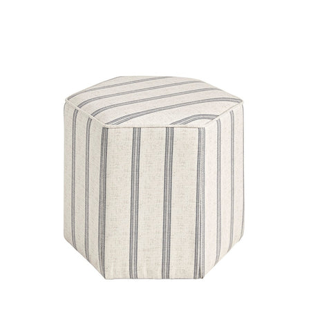 - Farmhouse style hexagonal ottoman in printed stripe upholstery