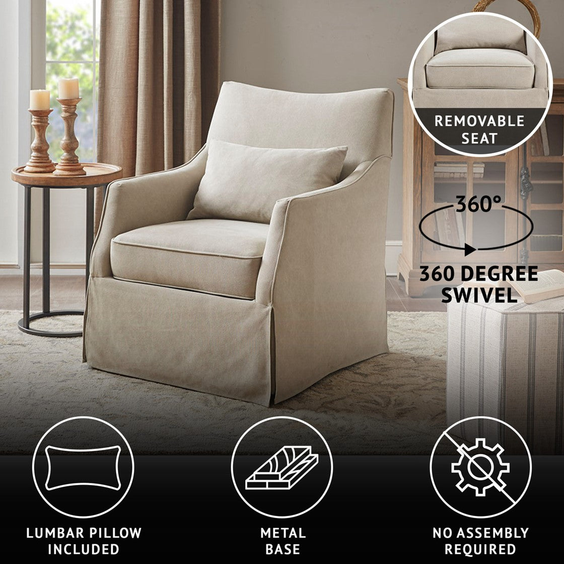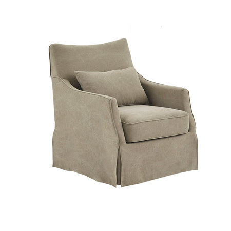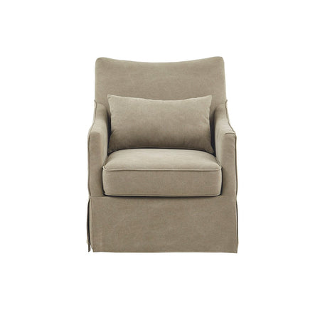 The Martha Stewart London Skirted Swivel Chair introduces a simple comfort to your living room decor. This swivel chair is upholstered in a soft tan fabric with a removable seat cushion that provides exceptional comfort. The metal swivel base allows the chair to fully rotate 360 degrees, while the skirted bottom helps conceal it for a transitional look. A lumbar pillow is also included. Incorporate this skirted swivel chair into your living space and add a farmhouse charm to your decor. No assembly required.