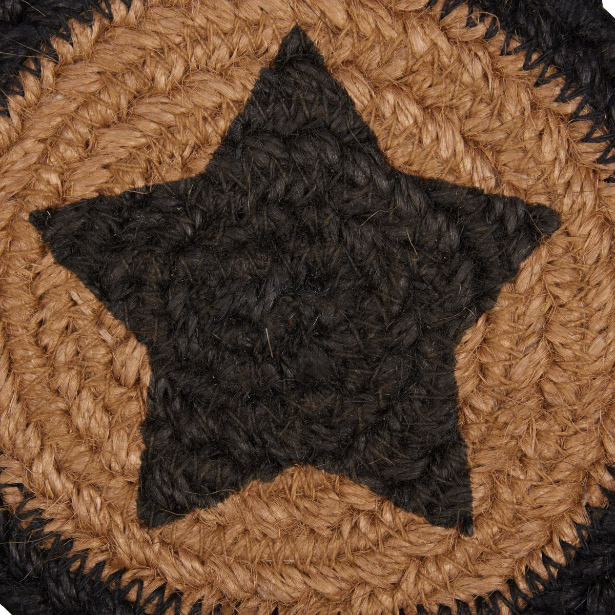 Avoid water rings and add primitive appeal to your tables with the Farmhouse Jute Coaster Stencil Star Set of 6. Crafted from natural jute fibers that are braided into a jute base, each 4-inch round coaster features a 5-point star stenciled on the front for country charm. Beautiful concentric braids of black and dark tan jute make up this primitive coaster set.
