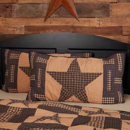 Complement the look of your quilt set with the Teton Star King Sham. Enjoy its patchwork block borders in navy and tan. A large 5 point star is centered on a tan background. Reverses to solid navy blue with 3 tie closures.
