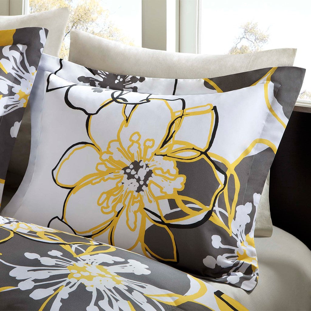 For a fresh look, the Allison Comforter Set can brighten up your room with its vibrant yellow and grey shades. The comforter and shams (1 for Twin/Twin XL) feature a printed, overscaled floral motif that is set to one side on a bright white backdrop. This beautiful design reverses to a solid grey color. The dark grey and black accent colors help to outline the oversized floral pattern and are used in the matching decorative pillow to correspond back to the bright yellows in this set. Made from polyester microfiber the comforter and shams (1 for Twin/Twin XL) are soft to the touch and machine washable for easy care. This floral comforter set has antimicrobial treatment that provides built-in freshness protection, reducing the growth of odor causing bacteria to keep fabric lasting longer.
