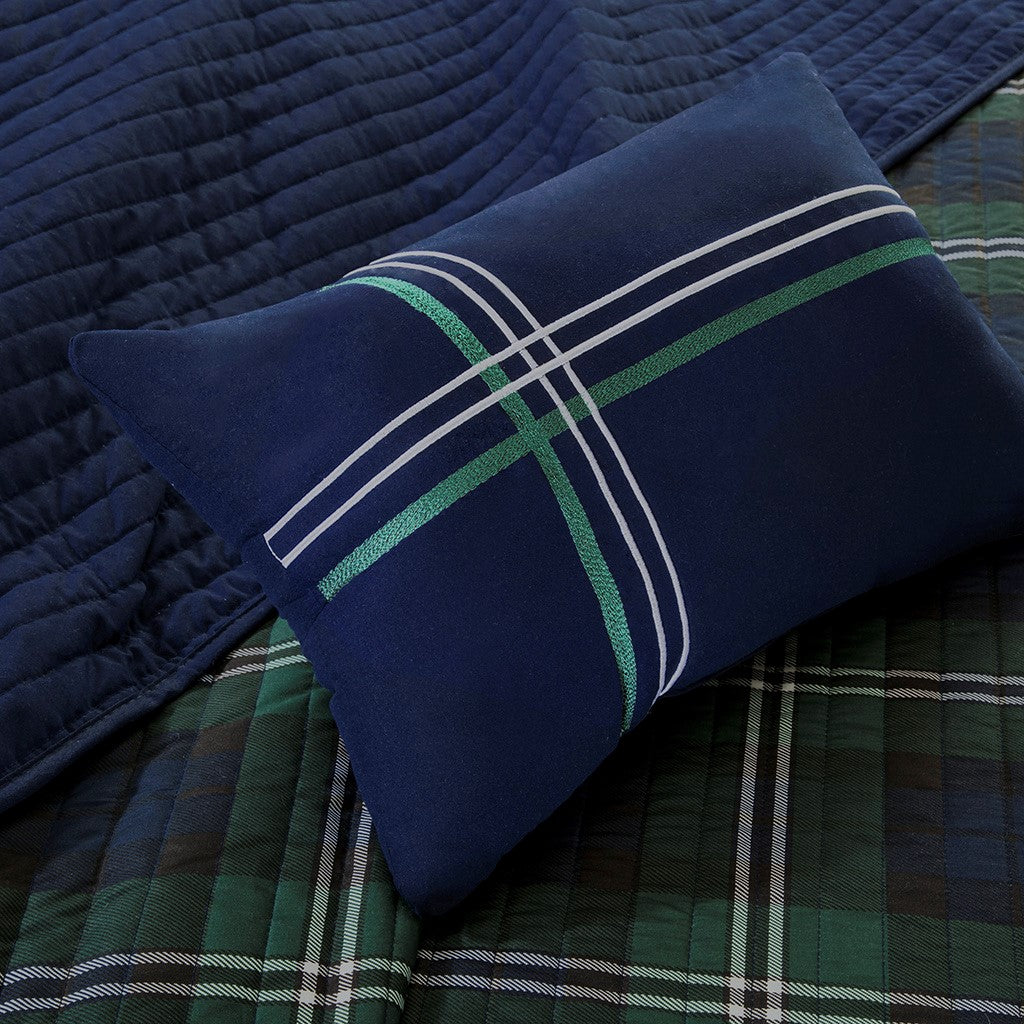 Add a sophisticated style to your bedroom with the Mi Zone Brody Reversible Coverlet Set. This coverlet and 2 shams (1 in Twin/TwinXL) features a blue and green plaid pattern with a solid blue reverse, creating a handsome cabin-inspired look. The quilted filling is pre-washed cotton for maximum comfort and durability. Completing this plaid coverlet is 1 oblong decorative pillow that pairs perfectly with the top of the bed. Machine washable for easy care, this reversible coverlet set uses an antimicrobial treatment that provides built-in freshness protection, reducing the growth of odor causing bacteria to keep fabric lasting longer. Items in the set may come in a rolled or compressed packaging, which will need to be fluffed up or steam ironed before use to remove wrinkles.
