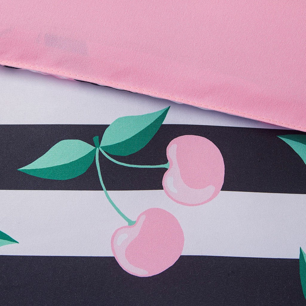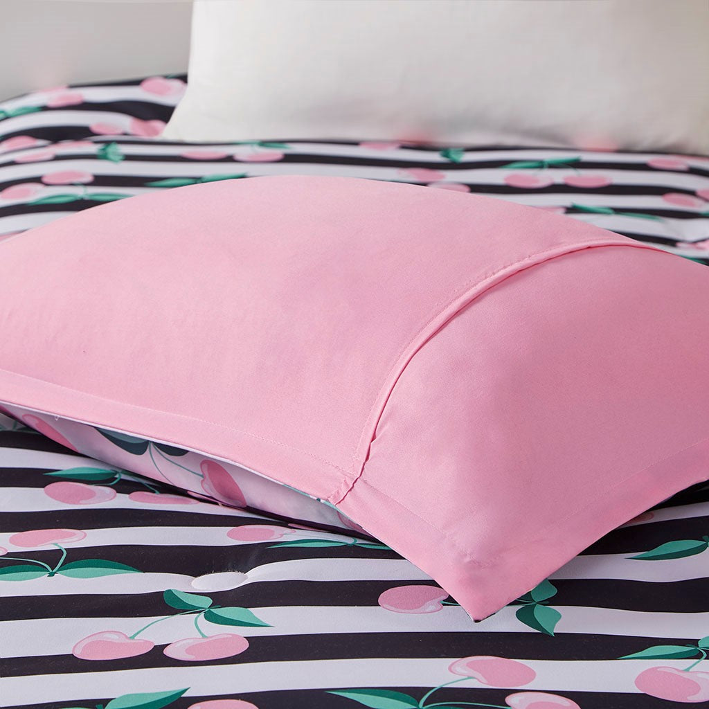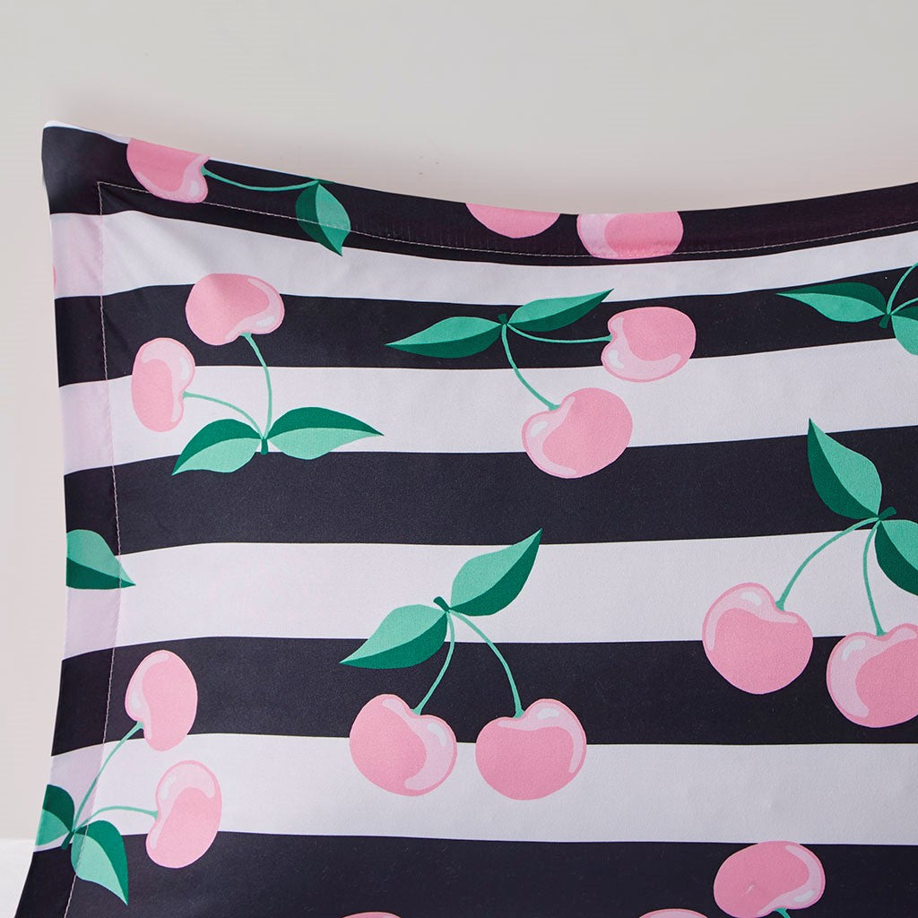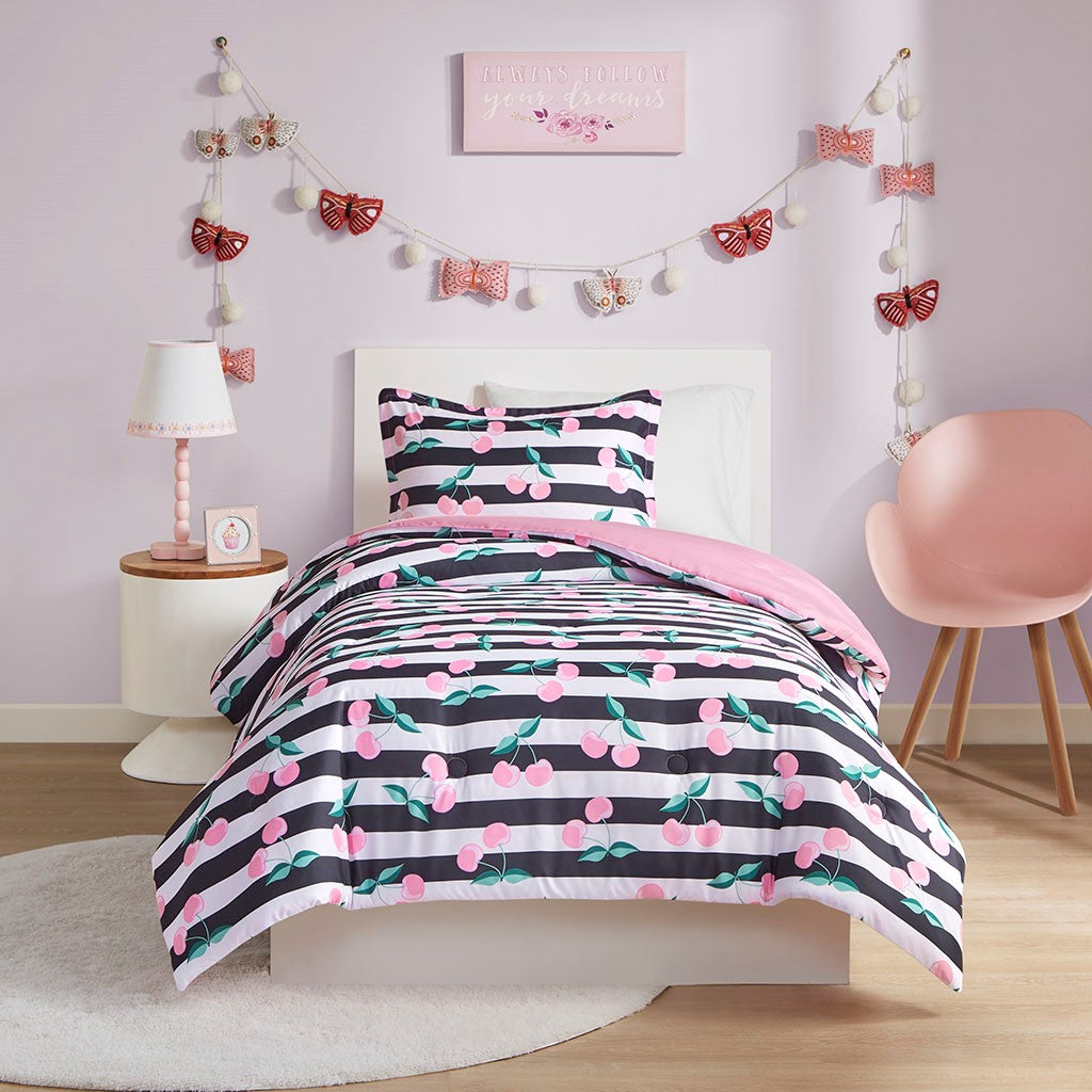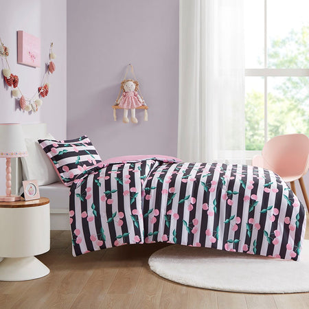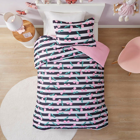 Bring a fresh modern look your kid's bedroom with the Mi Zone Kids Audrey Cherries Printed Comforter Set. This comforter and matching shams (1 in Twin) feature a cherry print on black and white stripes to create a fun, eye-catching look. Hypoallergenic polyester filling in the striped comforter provides exceptional warmth and comfort. An antimicrobial treatment helps reduce the growth of odor causing bacteria and keeps the fabric fresher, longer. Machine washable for easy care, this kid's bedding set may come in rolled or compressed packing and will need to be fluffed up. Use a steam iron to help remove wrinkles easier.