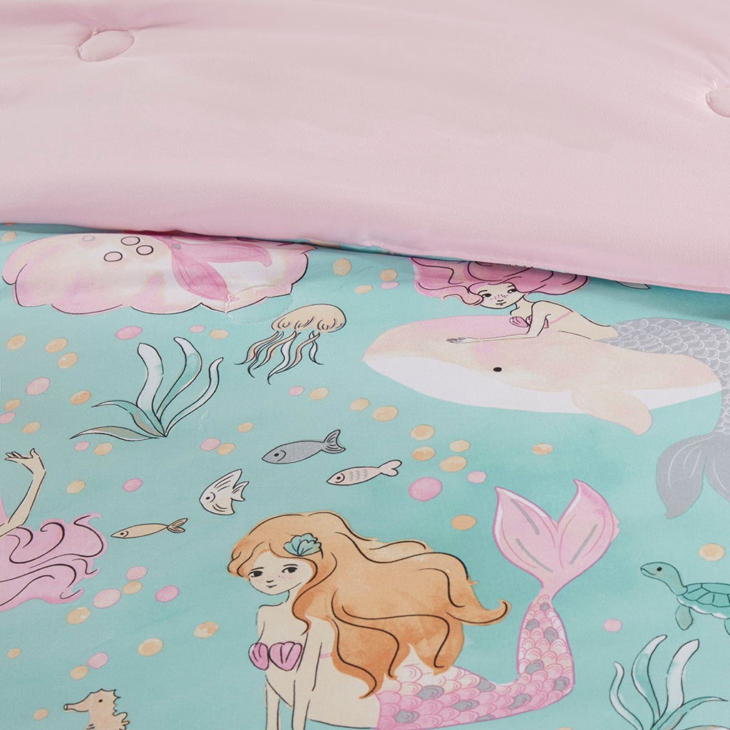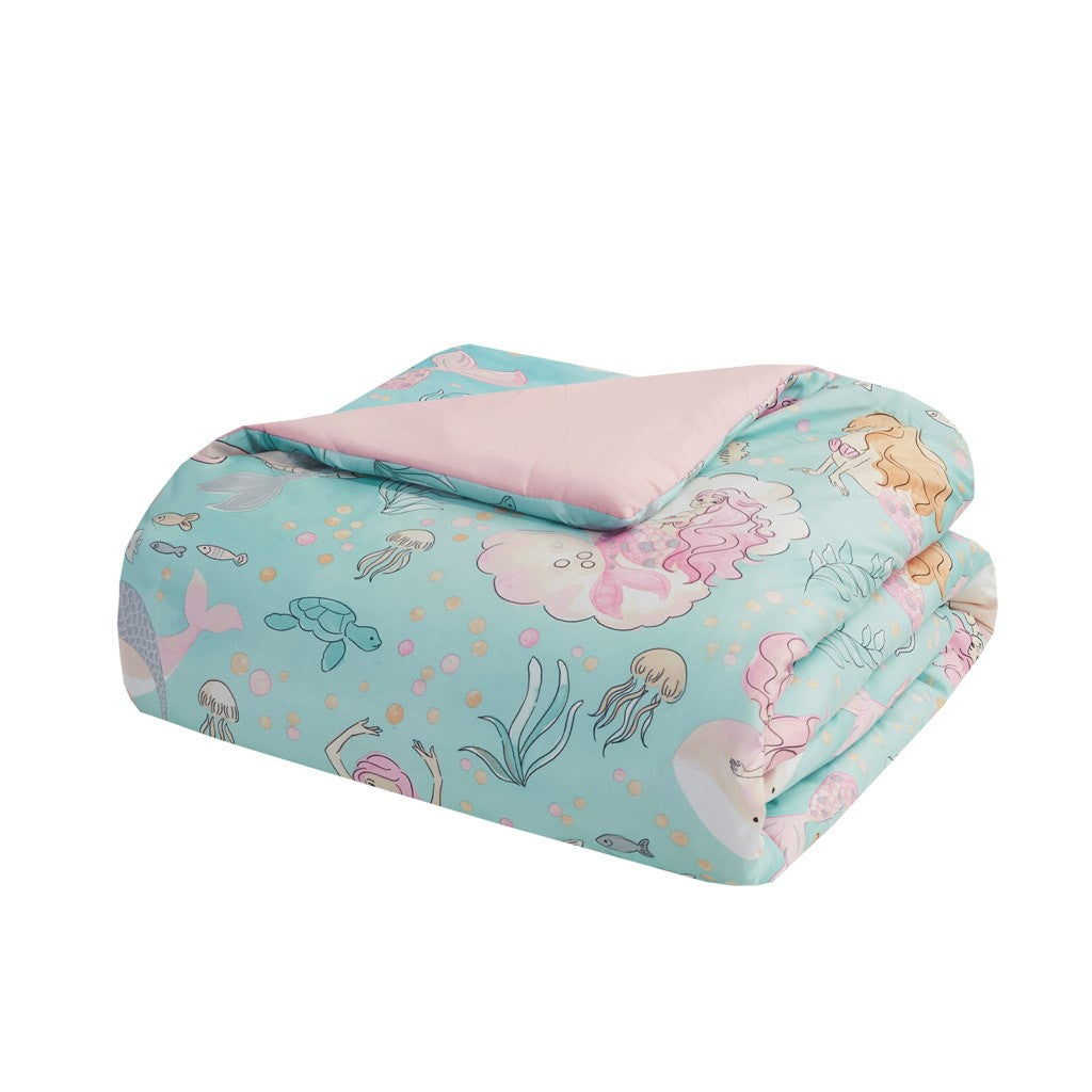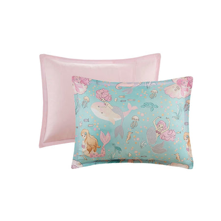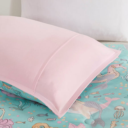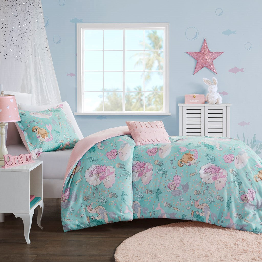 Bring a fun and colorful look to your girl's bedroom with the Mi Zone Kids Darya Printed Mermaid Comforter Set. The comforter and 2 matching shams (1 in Twin/TwinXL) with a 1-inch flange feature a delightful mermaid motif in bright aqua and pink colors. A solid pink reverse complements the top of the bed, while a decorative pillow provides a charming finishing touch. Made from ultra-soft fabric, this adorable children's comforter set is machine washable for easy care. This bedding set uses an antimicrobial treatment that provides built-in freshness protection, reducing the growth of odor causing bacteria to keep fabric lasting longer.