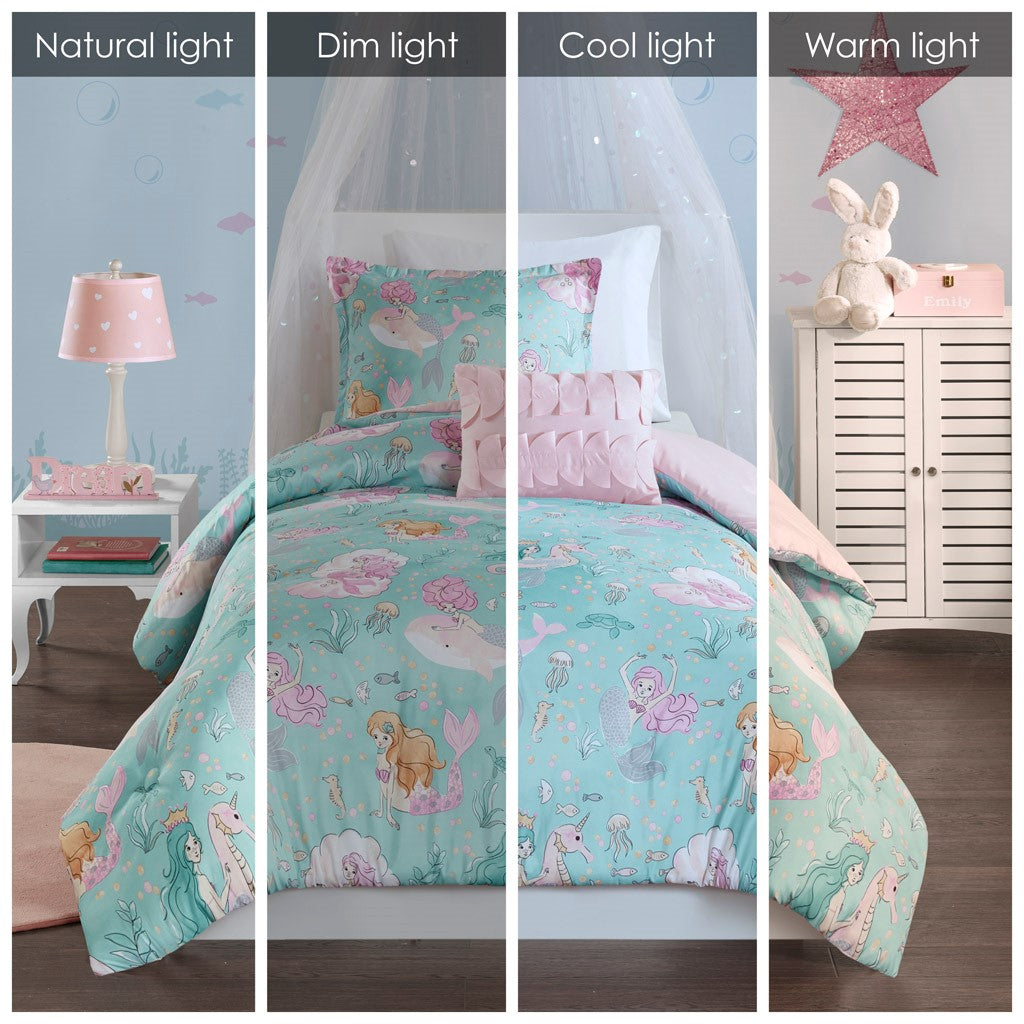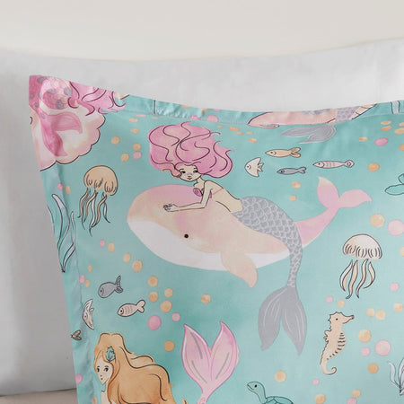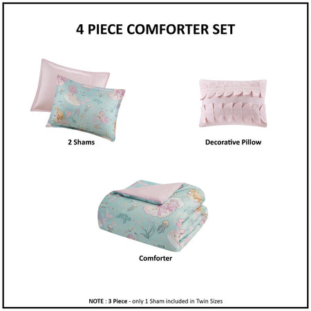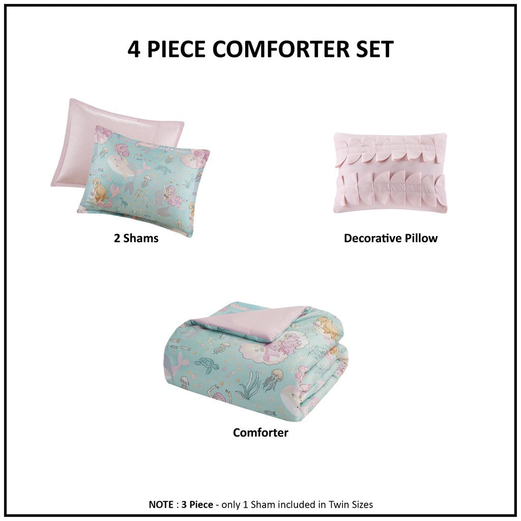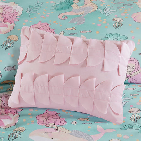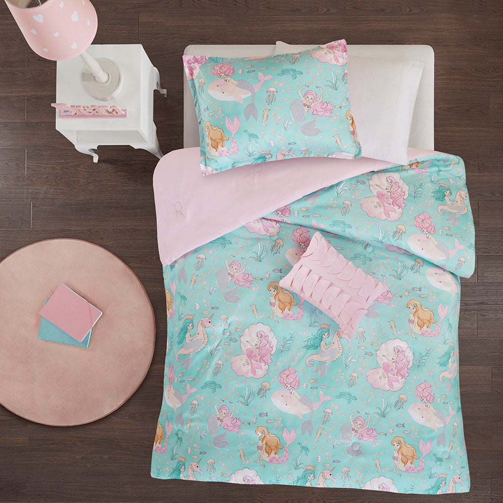 Bring a fun and colorful look to your girl's bedroom with the Mi Zone Kids Darya Printed Mermaid Comforter Set. The comforter and 2 matching shams (1 in Twin/TwinXL) with a 1-inch flange feature a delightful mermaid motif in bright aqua and pink colors. A solid pink reverse complements the top of the bed, while a decorative pillow provides a charming finishing touch. Made from ultra-soft fabric, this adorable children's comforter set is machine washable for easy care. This bedding set uses an antimicrobial treatment that provides built-in freshness protection, reducing the growth of odor causing bacteria to keep fabric lasting longer.