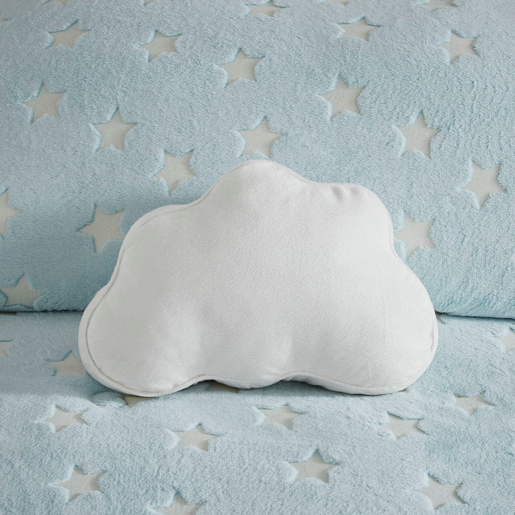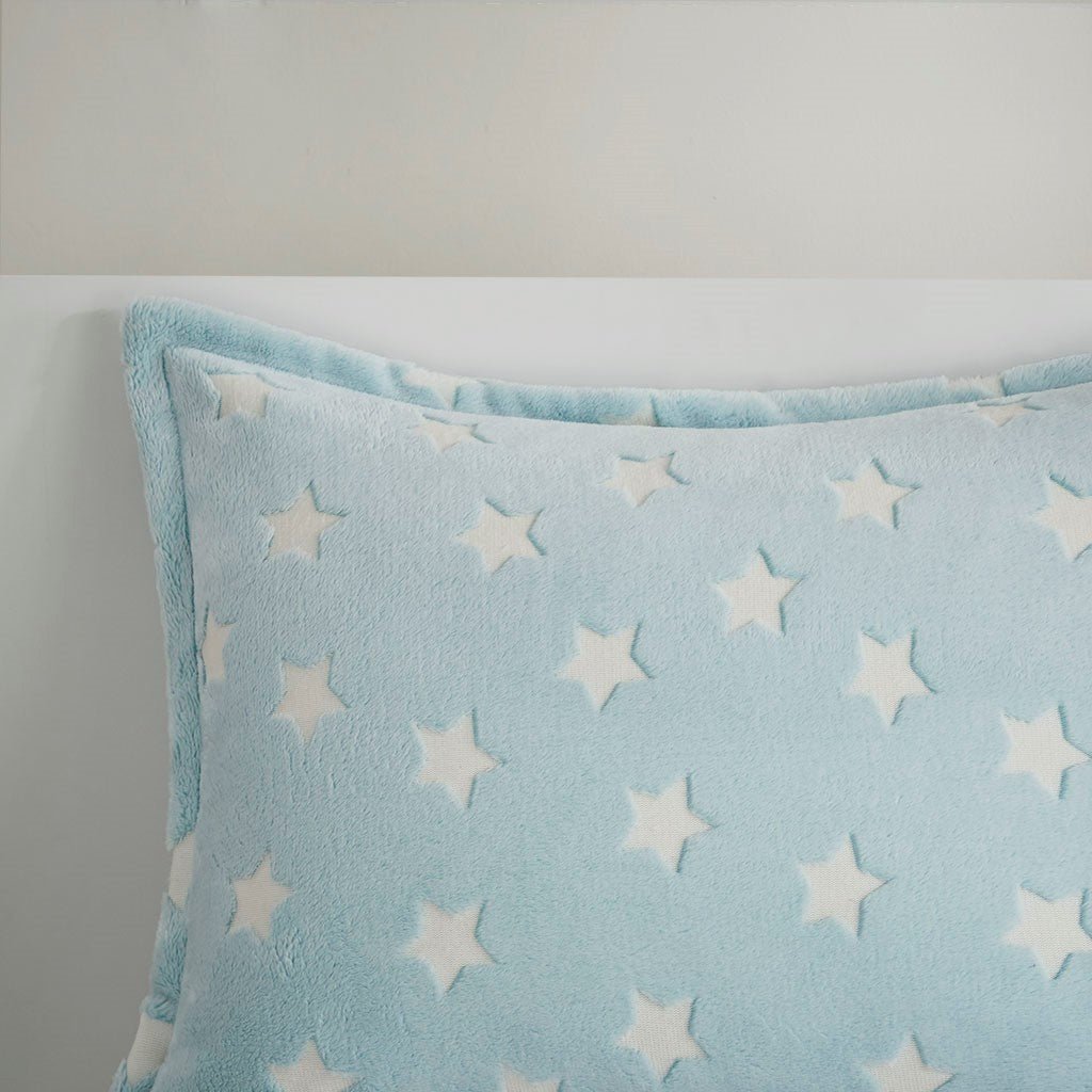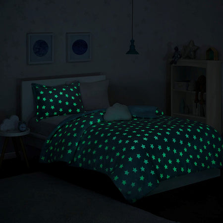 Sleep under the stars with the Mi Zone Kids Quinny Glow in the Dark Plush Comforter Set. The plush aqua comforter and shams (1 in Twin/TwinXL) feature glow-in-the-dark stars to create a whimsical look that bathes your kid's room in starlight. A cloud-shaped decorative pillow is also included to complete the incredibly soft glow-in-the-dark bedding set. Soft and cozy, this glow-in-the-dark plush comforter set brings a fantastically fun addition for your child's bedroom. Expose bedding to a light source and then turn off the lights to watch the stars glow! This bedding set is also OEKO-TEX certified, meaning it does not contain any harmful substances or chemicals to ensure quality comfort and wellness.