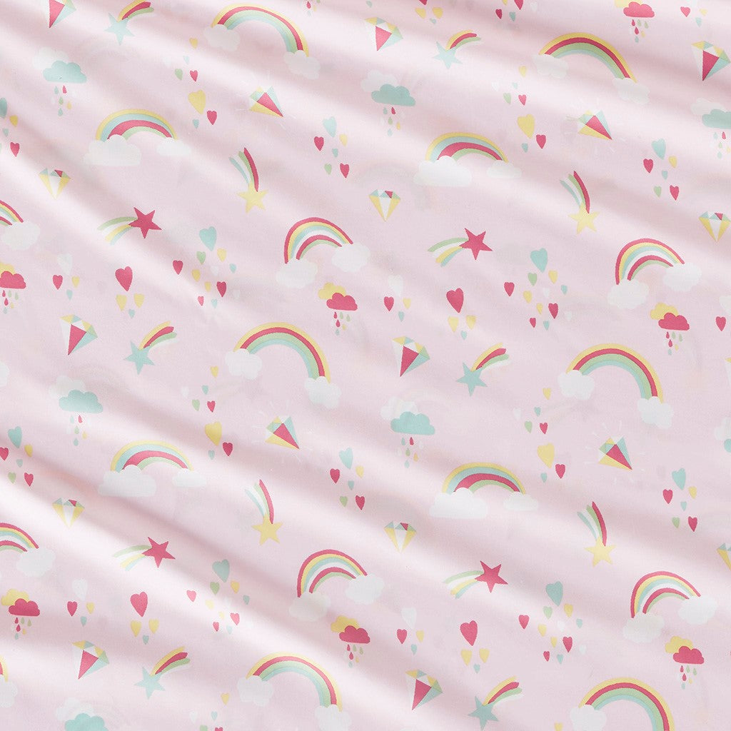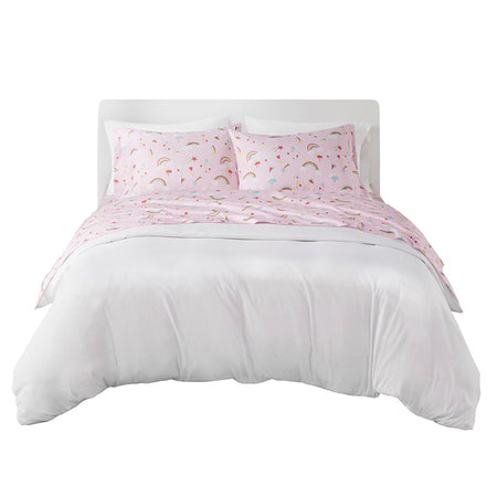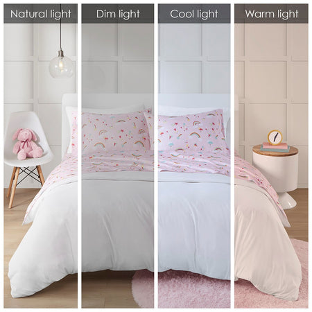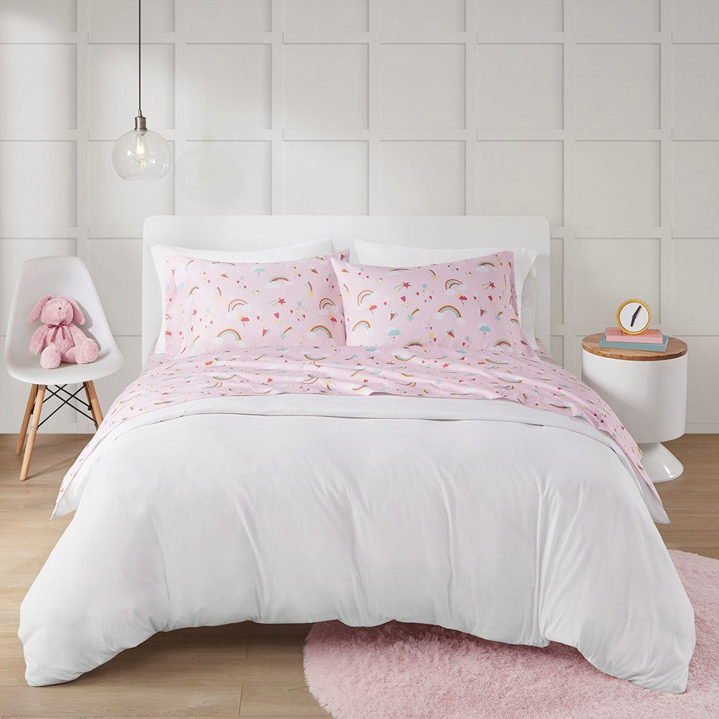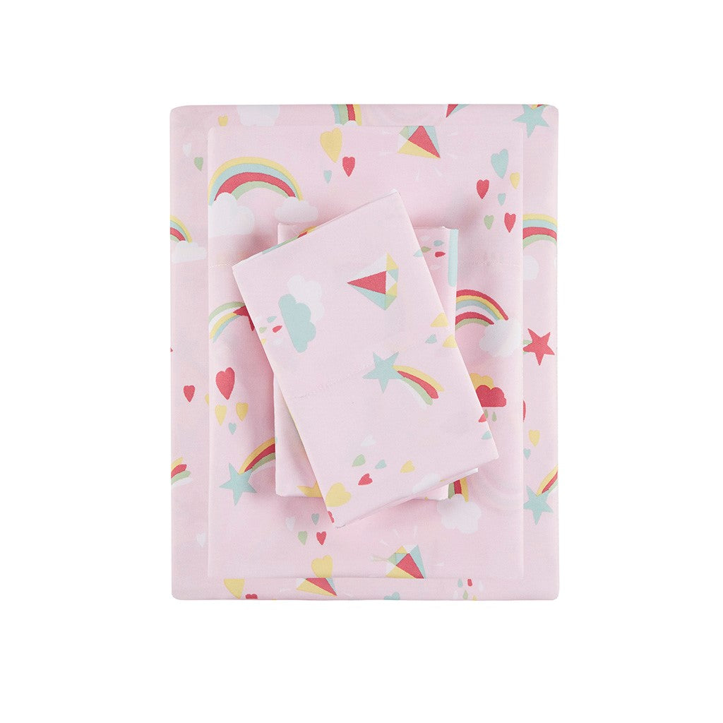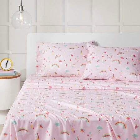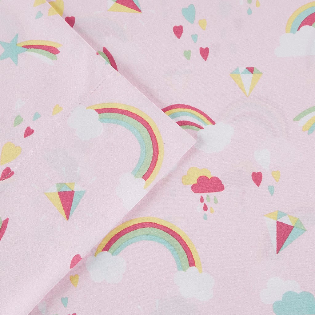 The Mi Zone Printed Sheet Set brings a delightful and charming update to your child's bedroom. This ultra-soft microfiber sheet set is naturally wrinkle-free and features an adorable rainbow on a pink background, to create an enticing and delectably sweet look. These novelty sheets are also OEKO-TEX certified, meaning they do not contain any harmful substances or chemicals, ensuring quality comfort and wellness. Set includes: 1 Flat Sheet, 1 Fitted Sheet, and 2 Pillowcases (1 in Twin).