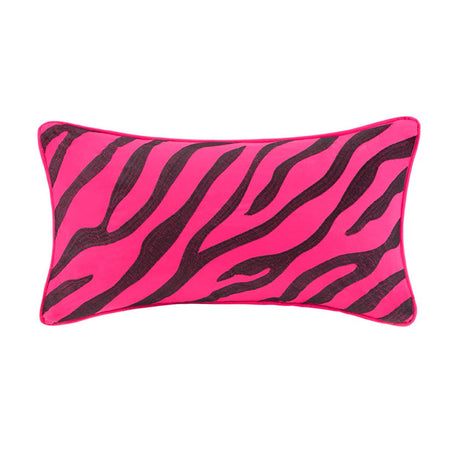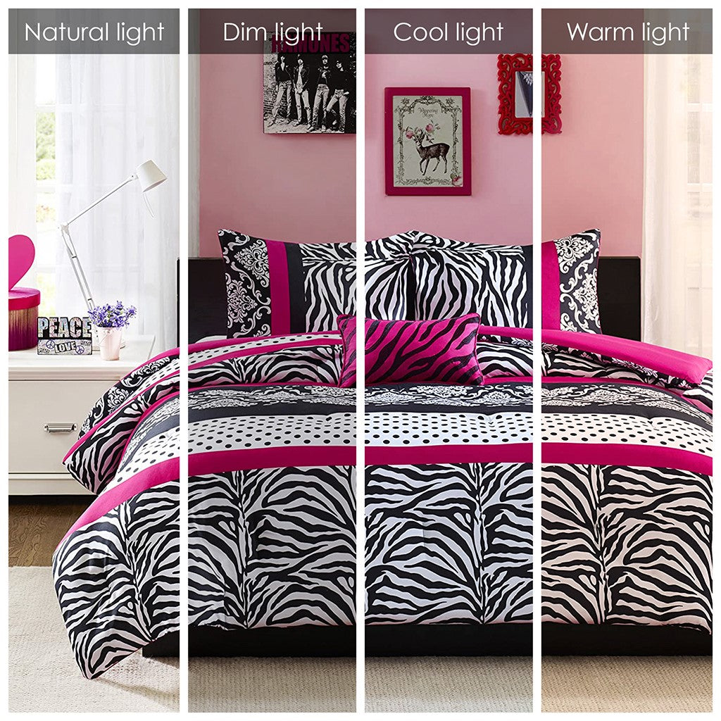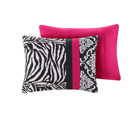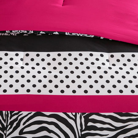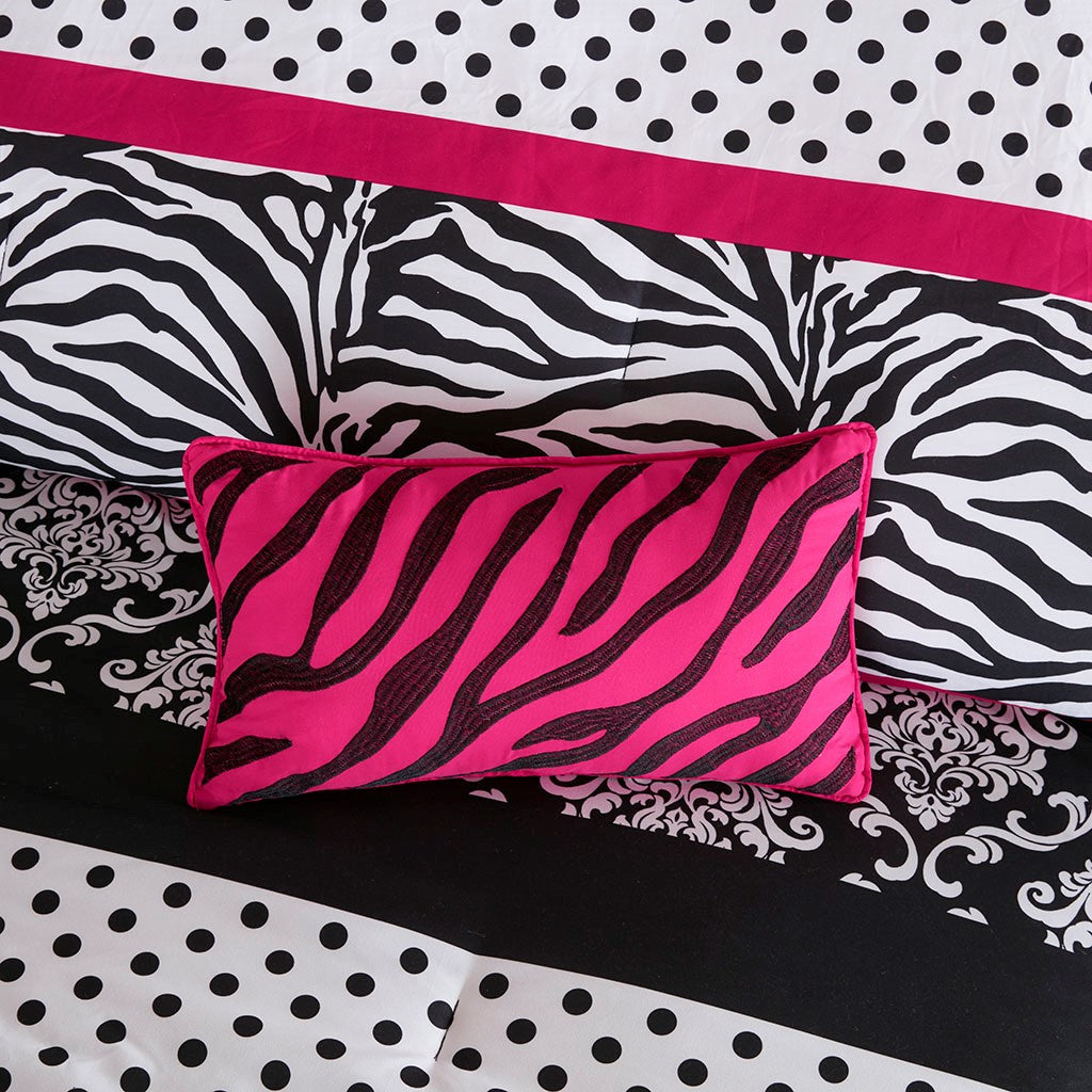Make a statement in your bedroom with the spunky style of the Mi Zone Reagan Set. The comforter flaunts a striped motif of damask patterns, polka dots, and zebra prints in striking black, white, and pink colors to create a fierce and bold look. The 2 matching shams (1 in Twin/TwinXL) repeat the striking design of the comforter, while an oblong decorative pillow with zebra stripes adds the finishing touch. This comforter set uses an antimicrobial treatment that provides built-in freshness protection, reducing the growth of odor causing bacteria to keep fabric lasting longer. Items in the set may come in a rolled or compressed packaging, which will need to be fluffed up or steam ironed before use to remove wrinkles.