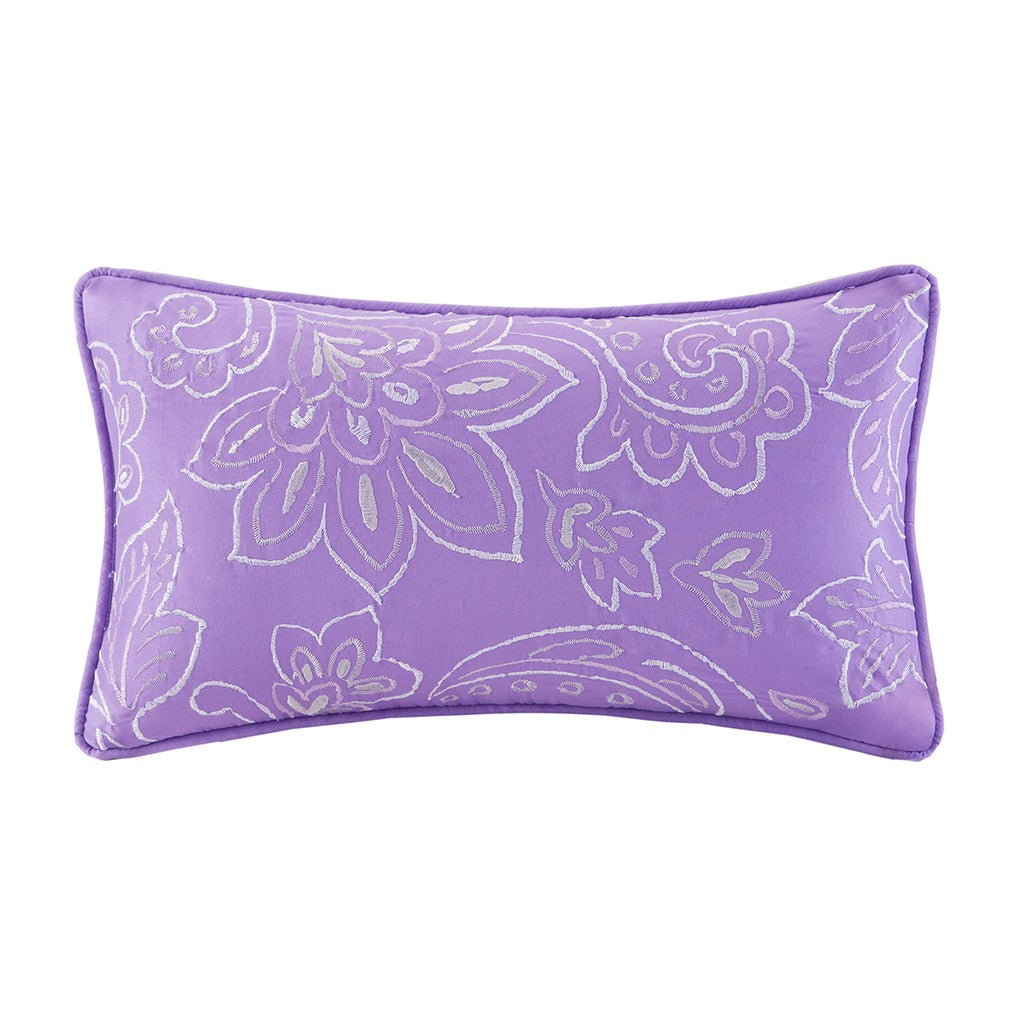 Brighten up your bedroom with the vivid charm of the Mi Zone Riley Comforter Set. The comforter features a stripe motif of polka dot, paisley, and floral prints, in purple, grey, and white colors, with a solid purple reverse, for a fashionable look. The 2 matching shams (1 in Twin/TwinXL) pair beautifully with the comforter, while an oblong decorative pillow with floral embroidery adds the finishing touch to the comforter set. This bedding set uses an antimicrobial treatment that provides built-in freshness protection, reducing the growth of odor causing bacteria to keep fabric lasting longer. Items in the set may come in a rolled or compressed packaging, which will need to be fluffed up or steam ironed before use to remove wrinkles.