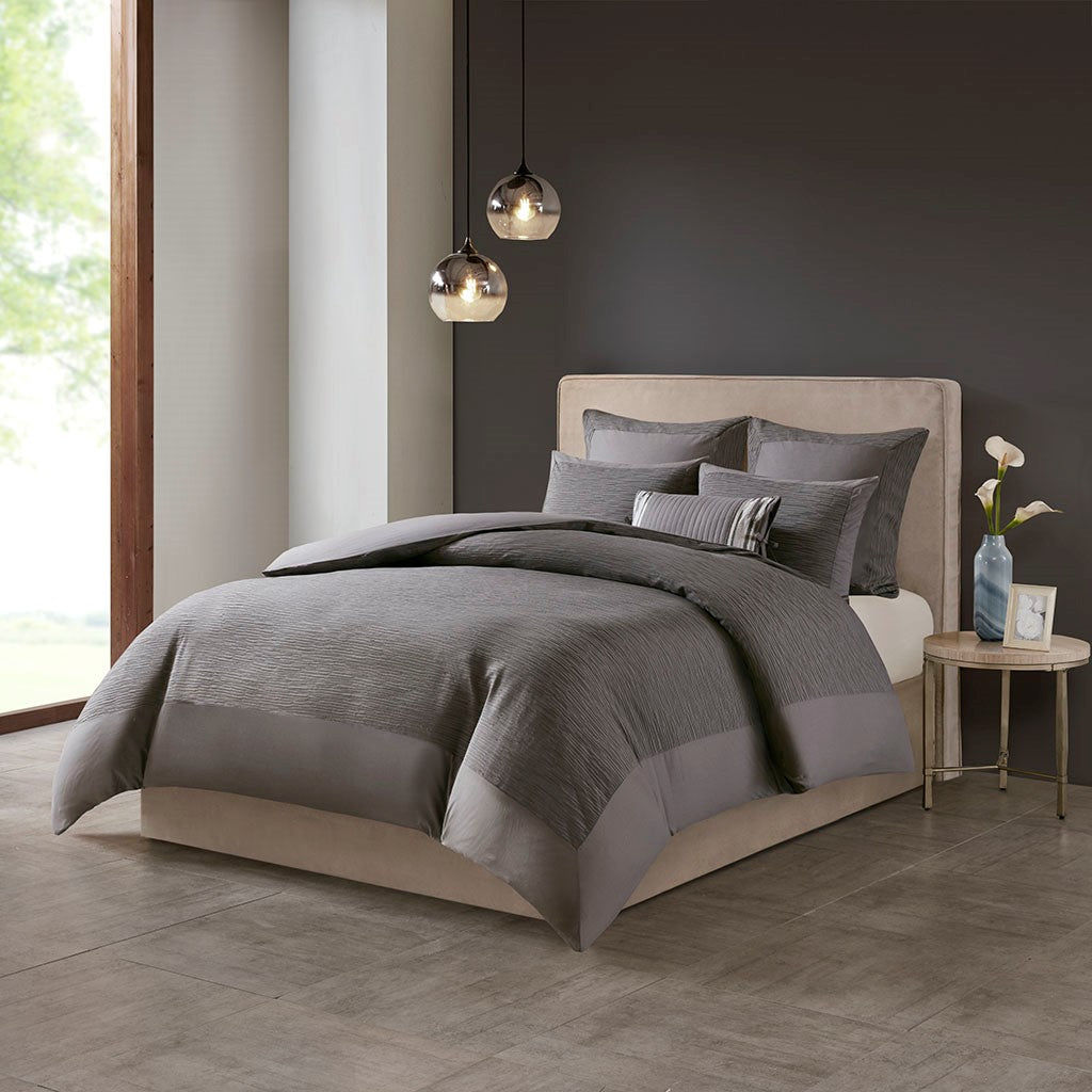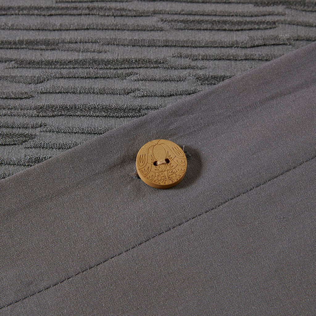Express your unique style with yarn dyed textural appeal of the N Natori Hanae 3 Piece Duvet Cover Set. The oversized grey duvet cover flaunts a textured fabric that adds dimension to the top of the bed and creates a cottage-inspired allure. Two matching shams feature a textured face with a solid reverse to pair beautifully with the duvet cover, completing the luxurious bedding set. With a fine attention to detail, this duvet cover set provides a glamorous update for your bedroom and is machine washable for easy care. Button closures allow you to place a comforter insert within the duvet cover and hidden tie-backs on the corners help prevent it from shifting (insert not included). Complete the look with the coodinating Hanae bedding accessories - Euro shams and decorative pillows that are sold separately.