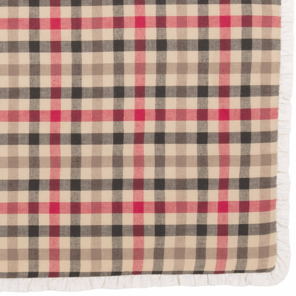 Add a soft and sweet wintry touch to your holiday decor this year with the Hollis Runner 13x36. A red, green, and ivory plaid is bordered by festive ruffles to give this country style runner a timeless Christmas look. 100% cotton shell with flannel lining.