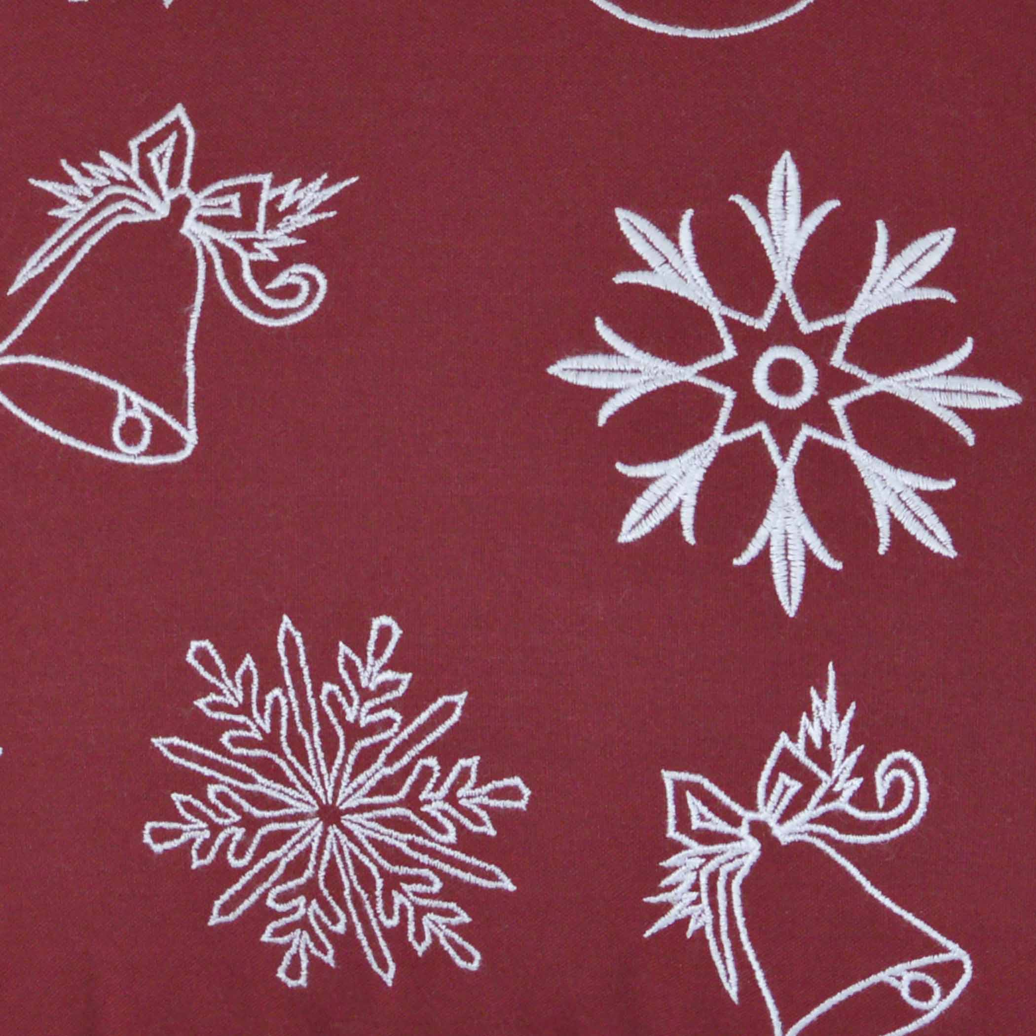 Relish the Holiday cheer and add traditional Christmas charm to your living space with the Snow Ornaments Pillow 14x18. Featuring crimson cotton embroidered with white ornaments, snowflakes, and bells for a truly festive and cozy look. Reverses to two button closures for easy care when washing is needed.