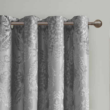 Our SunSmart Amelia Knitted Jacquard Paisley Total Blackout Grommet Top Curtain Panel adds the perfect touch of traditional elegance to your home. This total blackout grey curtain features an intricate paisley design on a heavy textured jacquard fabric, providing a rich and luxe sheen for beautiful texture and dimension. The foamback and bonding finish on the reverse makes this curtain 100% total blackout, blocking out all exterior light and noise intrusion for maximum privacy while also using thermal layer technology for energy efficiency and maximum energy savings. A silver grommet top finish makes this panel easy to hang, open, and close throughout the day; grommets fit up to a 1.25 inch diameter rod. As shown in image, 2 curtain panels will need to be purchased to provide coverage for any standard size window since this panel is sold as a single.