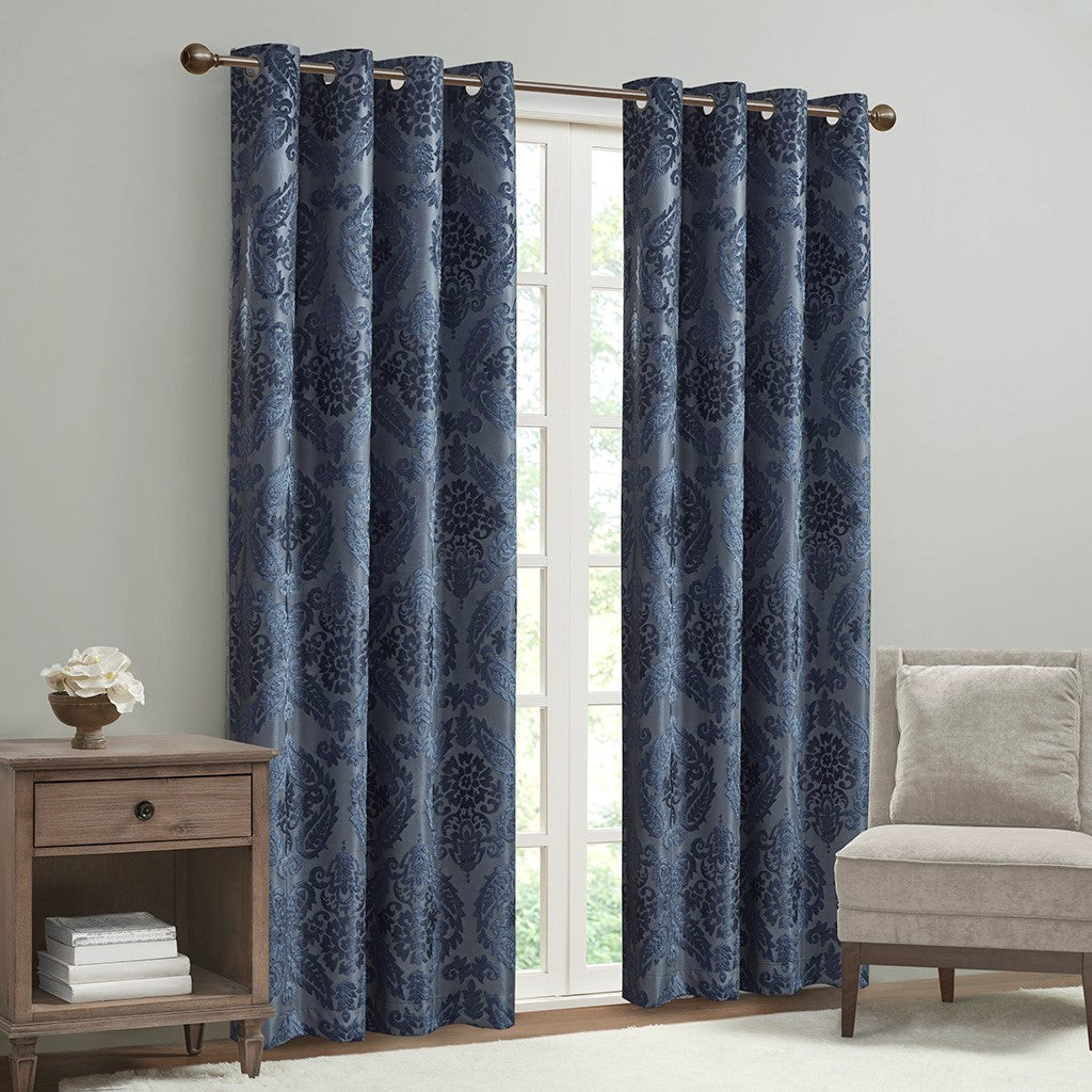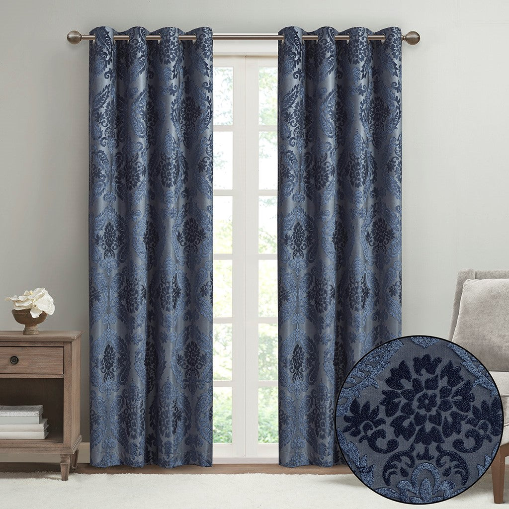 Amelia Knitted Jacquard Paisley Total Blackout Grommet Top Curtain Panel - Navy - 108" Panel