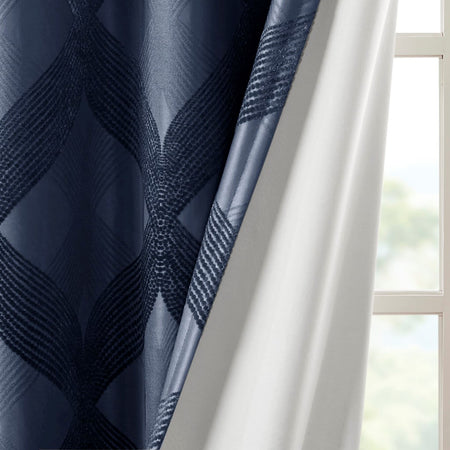 Combining luxe style with functionality, our SunSmart Bentley Ogee Knitted Jacquard Total Blackout Panel is the perfect update to dress any window. An ogee knitted jacquard design is featured in a rich navy hue, creating a luxurious sheen and texture. The heavy fabric uses a foamback and bonding finish enhancing the panel to block out all sunlight, provide a maximum protective barrier against noise intrusion, and offer a maximum level of privacy and energy savings. A silver grommet top finish makes it easy to hang, open, and close panels throughout the day; fits up to a 1.25"Â diameter rod. With 100% total blackout properties, this window panel is the perfect addition for bedrooms, media rooms, or any private spaces, giving your home a lavish and contemporary appeal. Lighting level: Pitch Black Ambiance.