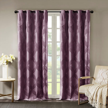 Combining luxe style with functionality, our SunSmart Bentley Ogee Knitted Jacquard Total Blackout Panel is the perfect update to dress any window. An ogee knitted jacquard design is featured in a rich plum hue, creating a luxurious sheen and texture. The heavy fabric uses a foamback and bonding finish enhancing the panel to block out all sunlight, provide a maximum protective barrier against noise intrusion, and offer a maximum level of privacy and energy savings. A silver grommet top finish makes it easy to hang, open, and close panels throughout the day; fits up to a 1.25" diameter rod. With 100% total blackout properties, this window panel is the perfect addition for bedrooms, media rooms, or any private spaces, giving your home a lavish and contemporary appeal. Lighting level: Pitch Black Ambiance.