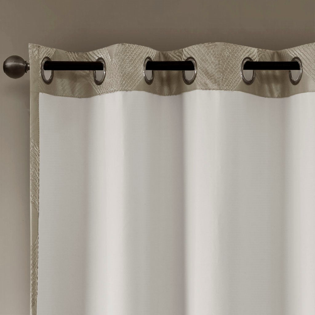 Combining luxe style with functionality, our SunSmart Bentley Ogee Knitted Jacquard Total Blackout Panel is the perfect update to dress any window. An ogee knitted jacquard design is featured in a rich taupe hue, creating a luxurious sheen and texture. The heavy fabric uses a foamback and bonding finish enhancing the panel to block out all sunlight, provide a maximum protective barrier against noise intrusion, and offer a maximum level of privacy and energy savings. A silver grommet top finish makes it easy to hang, open, and close panels throughout the day; fits up to a 1.25"Â diameter rod. With 100% total blackout properties, this window panel is the perfect addition for bedrooms, media rooms, or any private spaces, giving your home a lavish and contemporary appeal. Lighting level: Pitch Black Ambiance.