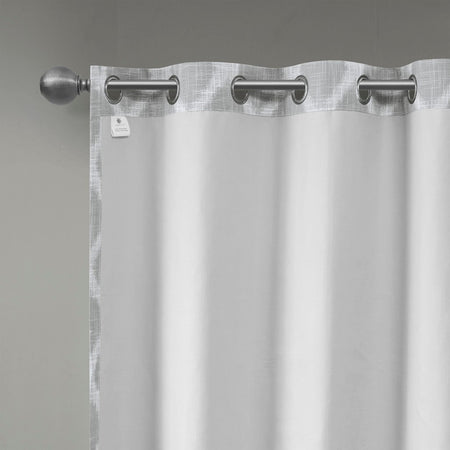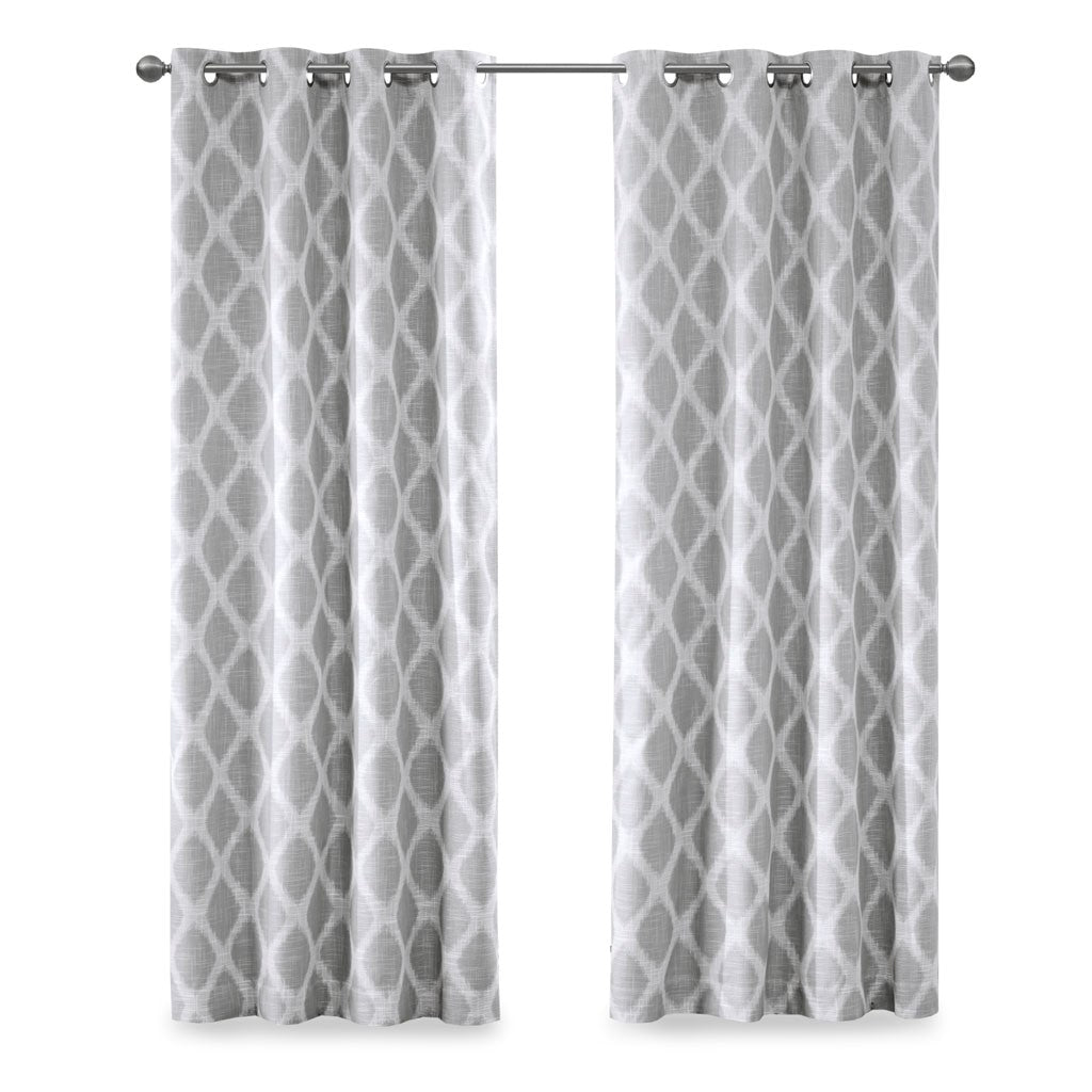 Introducing a modern and stylish take on energy efficiency, our SunSmart Blakesly Printed Ikat Blackout Panel is the perfect update to any room. Fresh and chic, this window panel features a printed grey ikat design on a textured firm base fabric, creating dimension for a cool and casual look. Finished with a two pass foamback and bonding technique, the panel is enhanced to block most sunlight and create a significant barrier to reduce outside noise. Silver grommet top detail makes it easy to hang, open, and close panels throughout the day; while fitting up to a standard 1.25"Â diameter rod. With considerable energy savings and a high level of added privacy, this blackout panel is perfect for home offices, family rooms, and bedrooms. Give your space a beautiful, one-of-a-kind update with this contemporary blackout window panel. Lighting level: Heavily Shaded Ambiance.