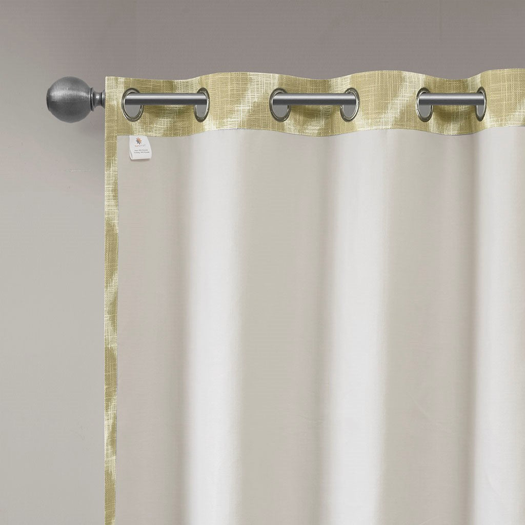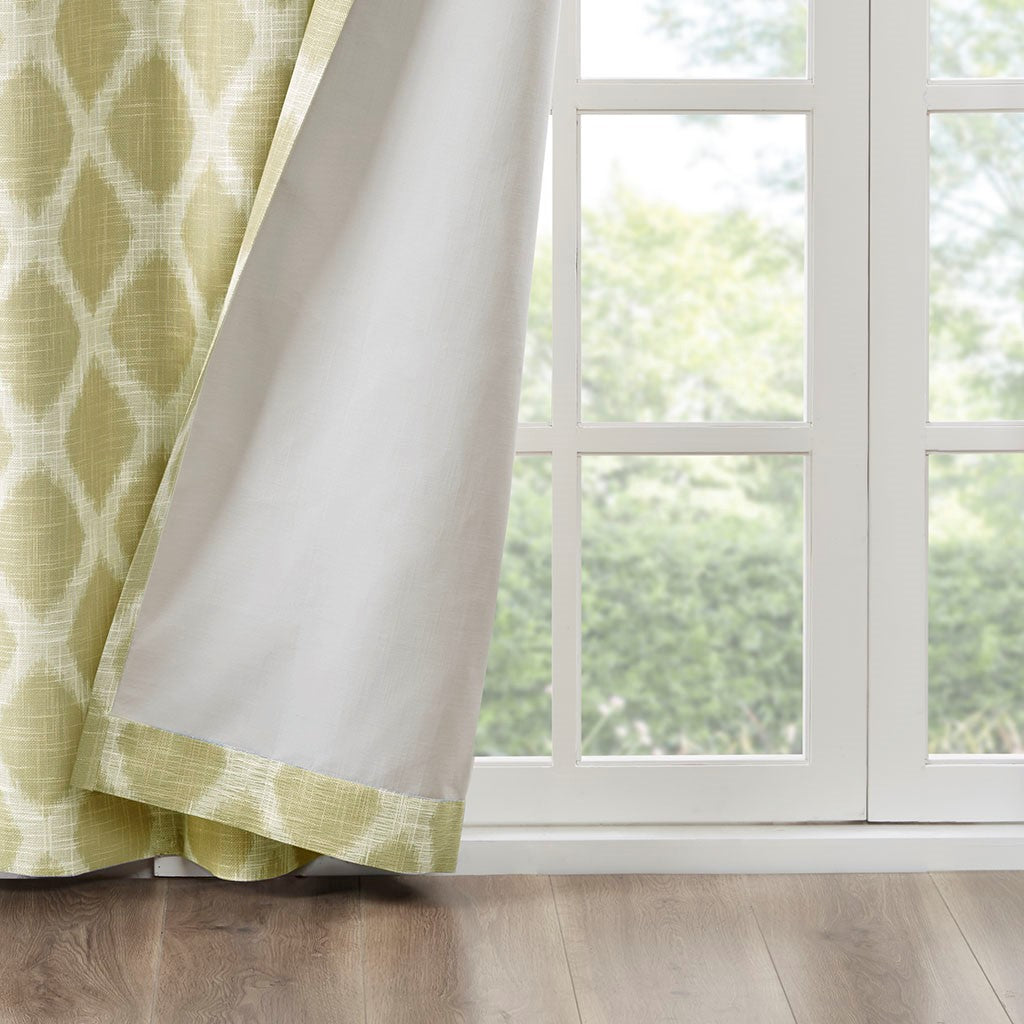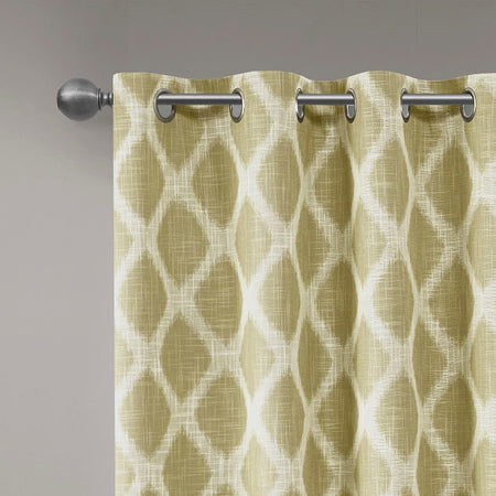 Introducing a modern and stylish take on energy efficiency, our SunSmart Blakesly Printed Ikat Blackout Panel is the perfect update to any room. Fresh and chic, this window panel features a printed yellow ikat design on a textured firm base fabric, creating dimension for a cool and casual look. Finished with a two pass foamback and bonding technique, the panel is enhanced to block most sunlight and create a significant barrier to reduce outside noise. Silver grommet top detail makes it easy to hang, open, and close panels throughout the day; while fitting up to a standard 1.25"Â diameter rod. With considerable energy savings and a high level of added privacy, this blackout panel is perfect for home offices, family rooms, and bedrooms. Give your space a beautiful, one-of-a-kind update with this contemporary blackout window panel. Lighting level: Heavily Shaded Ambiance.