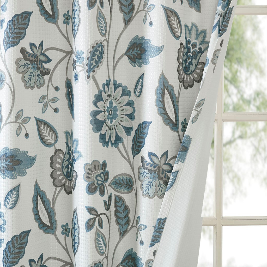 Beautifully frame your window with the stylish and functional SunSmart Camille Printed Room Darkening Curtain. A floral design in deep aqua, silver, and taupe hues is printed on a white dobby jacquard fabric creating texture and sheen for beautiful dimension and charm. Featuring a one pass foamback finish, this window panel provides a room darkening effect to soften harsh sunlight, while also serving as an effective barrier to dampen outside noise. In addition, this window panel is also OEKO-TEX certified, meaning it does not contain any harmful substances or chemicals, ensuring quality comfort and wellness. Silver grommets at the top make it easy to hang, open, and close throughout the day; fits up to a 1.25" diameter rod. Offering a moderate level of added privacy with nominal energy savings, this room darkening window panel brings a casual update to your home while creating a low ambiance lighting level, perfect for dining rooms, living rooms, or hallways.