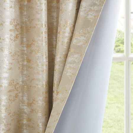 SunSmart Cassius Jacquard Total Blackout Panel is the perfect update to your windows, with its stunning beauty and functional style. This elegant window panel flaunts a marble jacquard design in rich gold hue creating a luxurious sheen, for a lavish look. A high-quality woven lining blocks out all sunlight, provides a maximum protective barrier against noise intrusion, and offers a maximum level of privacy and energy savings. With 100% total blackout properties, this window panel is the perfect addition for bedrooms, media rooms, or any private spaces. These blackout curtains are also OEKO-TEX certified, meaning they do not contain any harmful substances or chemicals, for quality comfort and wellness. The rod pocket top and back tabs create a clean finish to your window giving your home a gorgeous touch of luxury. Fits up to a 1.25" diameter rod. Lighting level: Pitch Black Ambiance. Complete the look with coordinating valance, sold separately.