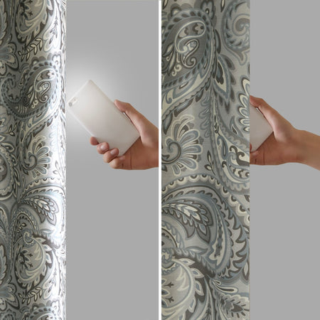 Our SunSmart Jenelle Paisley Printed Total Blackout Window Panel offers a stunning and stylish update to your home, while embracing simple functionality. This curtain features a beautiful paisley print in soft grey hues, combined with a light sheen faux silk base fabric for an elegant and transitional look. An added full blackout lining blocks out all outside light and creates a maximum protective barrier against noise and intrusion to ensure the highest level of privacy. Using thermal technology, this window panel helps provide maximum energy saving by keeping your room cool or warm as needed. Grommet top makes this panel easy to hang, open, and close through the day. This 100% total blackout window panel is perfect for bedrooms, media rooms, or any private space, providing a lighting level of pitch black ambiance when fully closed. Fits up to a 1.25"Â diameter rod.