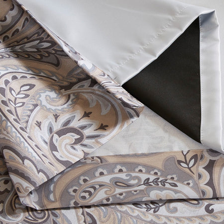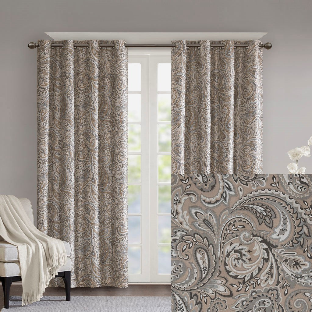 Our SunSmart Jenelle Paisley Printed Total Blackout Window Panel offers a stunning and stylish update to your home, while embracing simple functionality. This curtain features a beautiful paisley print in rich taupe hues, combined with a light sheen faux silk base fabric for an elegant and transitional look. An added full blackout lining blocks out all outside light and creates a maximum protective barrier against noise and intrusion to ensure the highest level of privacy. Using thermal technology, this window panel helps provide maximum energy saving by keeping your room cool or warm as needed. Grommet top makes this panel easy to hang, open, adn close thorugh the day. This 100% total blackout window panel is perfect for bedrooms, media rooms, or any private space, providing a lighting level of pitch black ambiance when fully closed. Fits up to a 1.25"Â diameter rod.