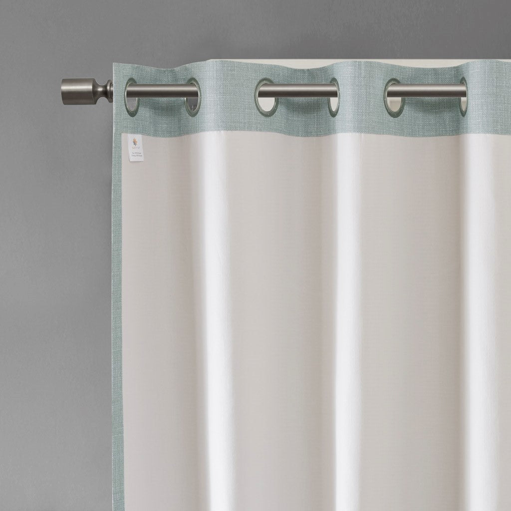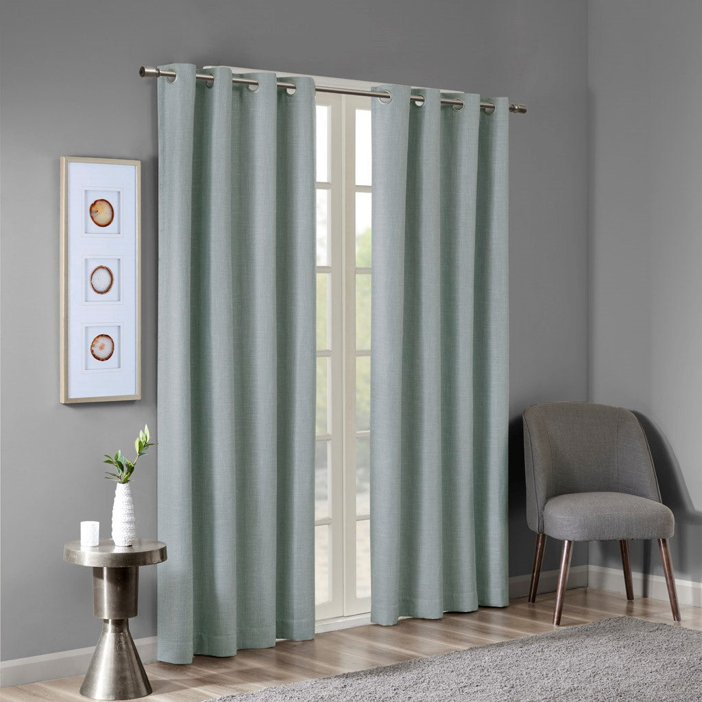 Energy efficiency meets chic casual style, with our SunSmart Maya Printed Heathered Blackout Panel. Featuring a printed heathered design in a soft dusty seafoam hue, this blackout window panel is made from a textured polyester slub base fabric creating beautiful texture and dimension. A one pass foamback finish with additional bonding is added and enhances the panel to buffer most sunlight, while also creating a significant barrier to reduce outside noise. The silver grommet top makes it easy to hang, open, and close the window panel throughout the day; fits up to a 1.25"Â diameter rod. Perfect for home offices, family rooms, and bedrooms - this blackout panel provides considerable energy savings and a high-level of privacy by bringing a heavily shaded lighting level to any room.