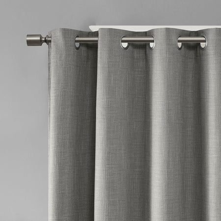 Energy efficiency meets chic casual style, with our SunSmart Maya Printed Heathered Blackout Panel. Featuring a printed heathered design in a cool grey hue, this blackout window panel is made from a textured polyester slub base fabric creating beautiful texture and dimension. A one pass foamback finish with additional bonding is added and enhances the panel to buffer most sunlight, while also creating a significant barrier to reduce outside noise. The silver grommet top makes it easy to hang, open, and close the window panel throughout the day; fits up to a 1.25"Â diameter rod. Perfect for home offices, family rooms, and bedrooms - this blackout panel provides considerable energy savings and a high-level of privacy by bringing a heavily shaded lighting level to any room.