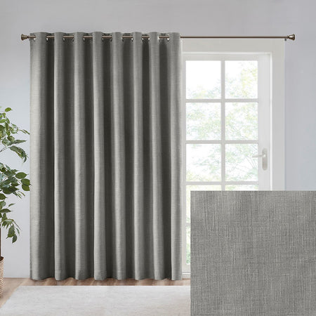 Energy efficiency meets chic casual style, with our SunSmart Maya Printed Heathered Blackout Patio Panel. Featuring a printed heathered design in a cool grey hue, this blackout patio window panel is made from a textured polyester slub base fabric creating beautiful texture and dimension. A one pass foamback finish with additional bonding is added and enhances the panel to buffer most sunlight, while also creating a significant barrier to reduce outside noise. The silver grommet top makes it easy to hang, open, and close the panel throughout the day; fits up to a 1.25"Â diameter rod. Perfect for any space - this blackout patio panel provides considerable energy savings and a high-level of privacy by bringing a heavily shaded lighting level to any room.