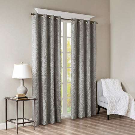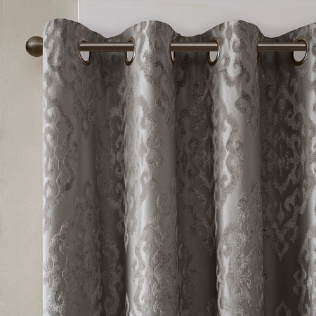 - Total blackout grommet top curtain panel in knitted jacquard damask design