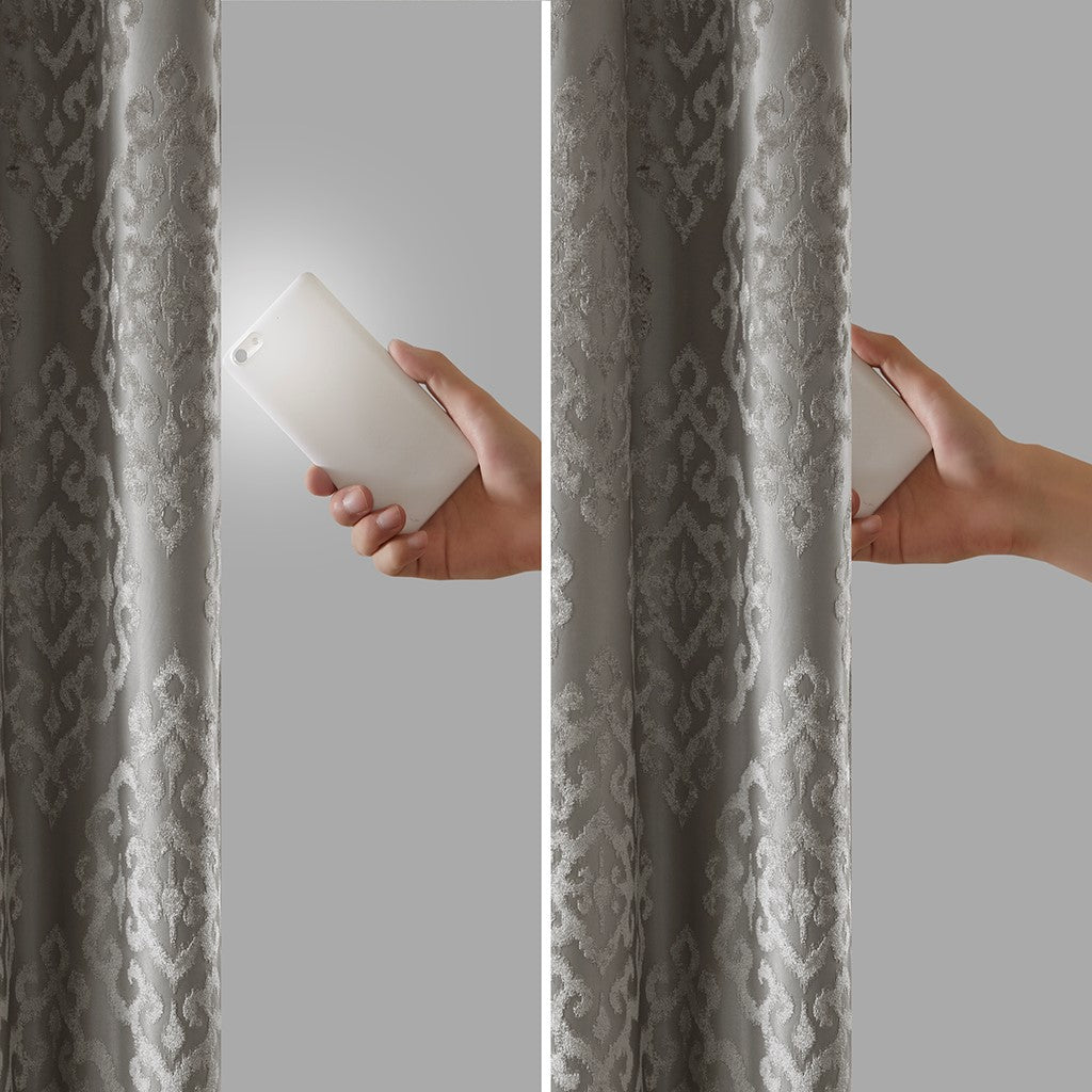 Give your home the lavish style and energy efficiency it deserves with our SunSmart Mirage Knitted Jacquard Total Blackout Panel. This elegant window panel flaunts a knitted jacquard damask design in a rich charcoal hue, creating a luxurious sheen and texture. The heavyweight fabric features a foam-back and bonding finish that blocks out all sunlight and provides a maximum protective barrier against noise intrusion. With 100% total blackout properties, this window panel offers a maximum level of privacy and energy savings, which makes it perfect for bedrooms, media rooms, or any private spaces. A gunmetal grommet top detail completes the look, while also making it easy to hang, open, and close the window panel throughout the day. Fits up to a 1.25"Â diameter rod. Lighting level: Pitch Black Ambiance.