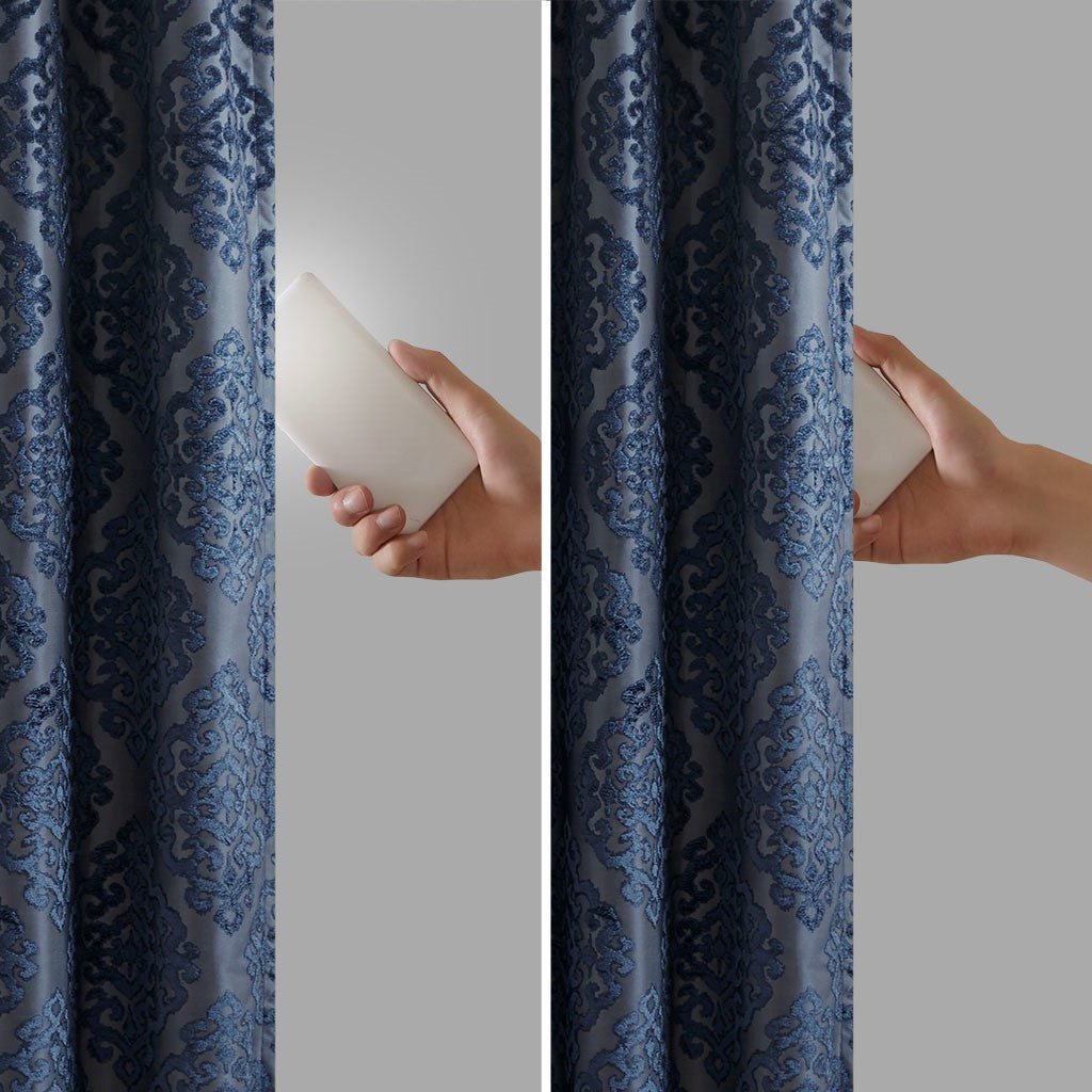 Give your home the lavish style and energy efficiency it deserves with the SunSmart Mirage Knitted Jacquard Total Blackout Panel. This elegant window panel flaunts a knitted jacquard damask design in a rich grey ground with navy burnout pattern, creating a luxurious sheen and texture. The heavyweight fabric features a foam-back and bonding finish that blocks out all sunlight and provides a maximum protective barrier against noise intrusion. With 100% total blackout properties, this window panel offers a maximum level of privacy and energy savings, which makes it perfect for bedrooms, media rooms, or any private spaces. A silver grommet top detail completes the look, while also making it easy to hang, open, and close the window panel throughout the day. Fits up to a 1.25"Â diameter rod. Lighting level: Pitch Black Ambiance.