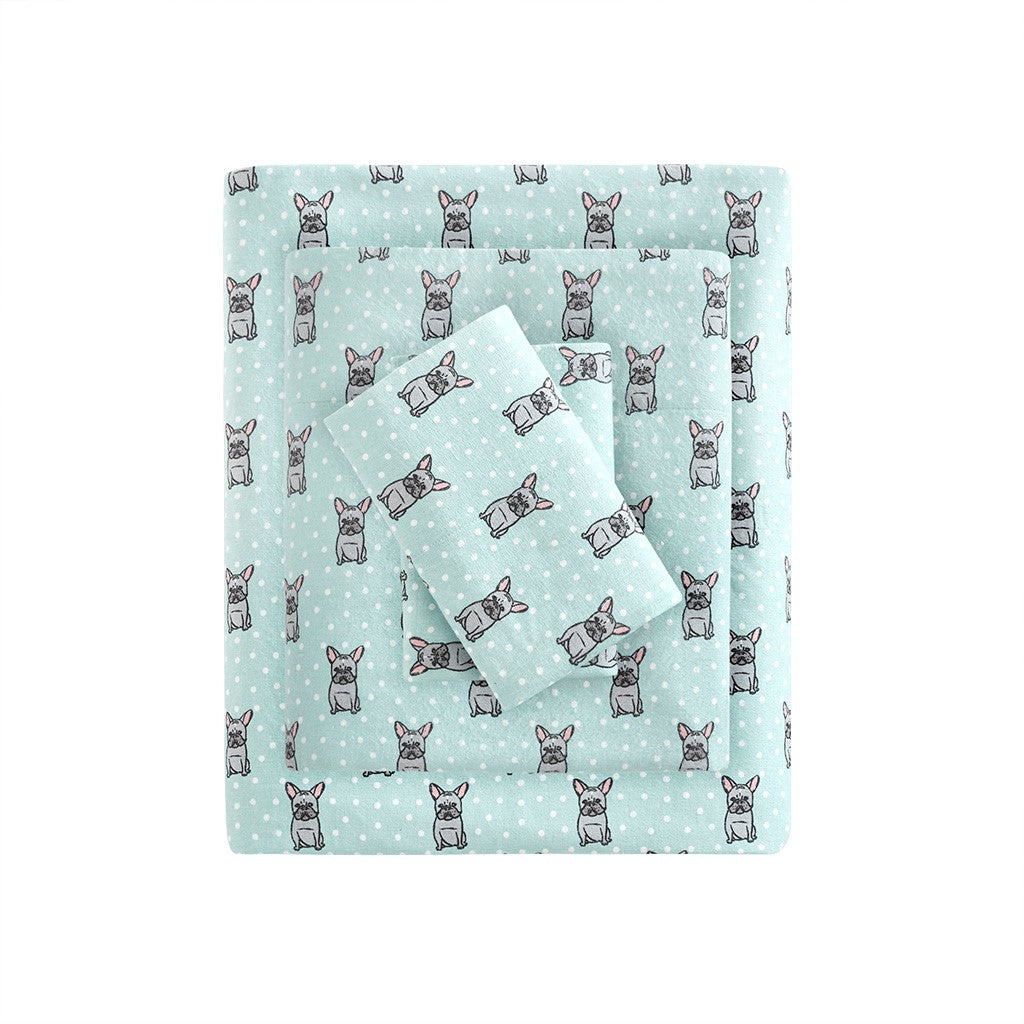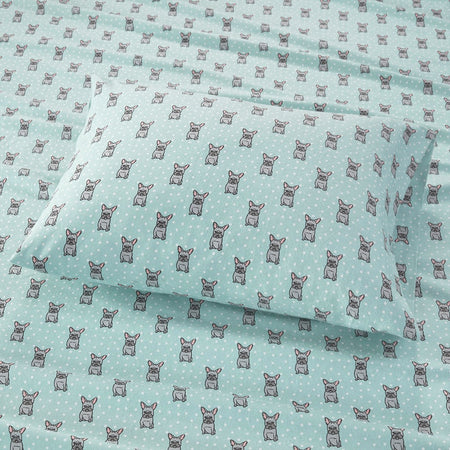 Cozy Cotton Flannel Printed Sheet Set - Aqua French Bulldog - Queen Size