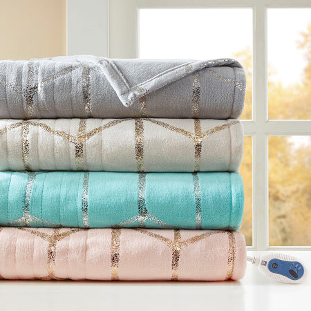 True North by Sleep Philosophy offers incredible comfort and style with the Raina Heated Metallic Print Throw. A gold metallic geometric design is beautifully printed on an ultra-soft plush blush base fabric. Emitting virtually no electromagnetic field emissions, this throw features three heat settings and a 2-hour shut-off timer to provide the perfect amount of warmth and comfort. Bundle up in comfort and add a casual touch with a glamorous flair to your home with this heated metallic print throw. This throw is OEKO-TEX certified, meaning it does not contain any harmful substances or chemicals to ensure quality comfort and wellness. Includes manufacturer's 5-year warranty.