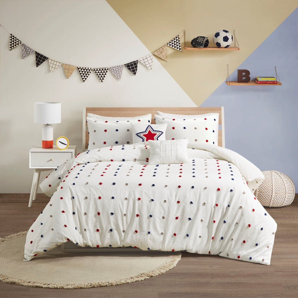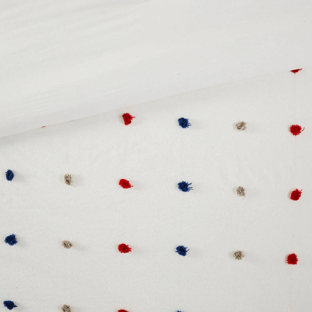 Make a handsome fashion statement in your child's bedroom with the Urban Habitat Kids Callie Cotton Jacquard Pom Pom Comforter Set. This cotton comforter features a red and navy jacquard pom pom design, on the face, for a fun shabby chic look. Matching shams (1 for Twin/TwinXL) pair perfectly with the comforter, while a square and an oblong decorative pillow complete this adorable kid's comforter set. Machine washable, this bedding set is also OEKO-TEX certified, meaning it does not contain any harmful substances or chemicals to ensure quality comfort and wellness.