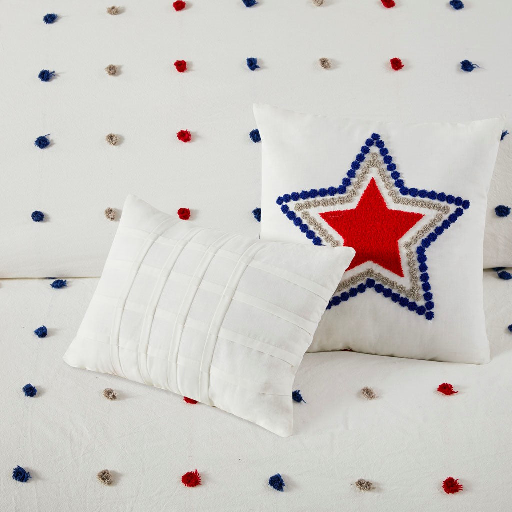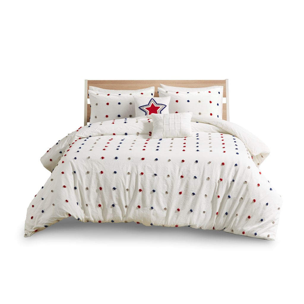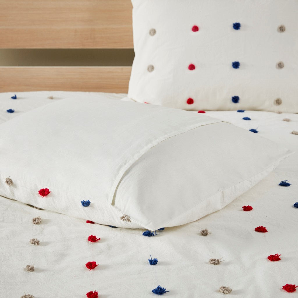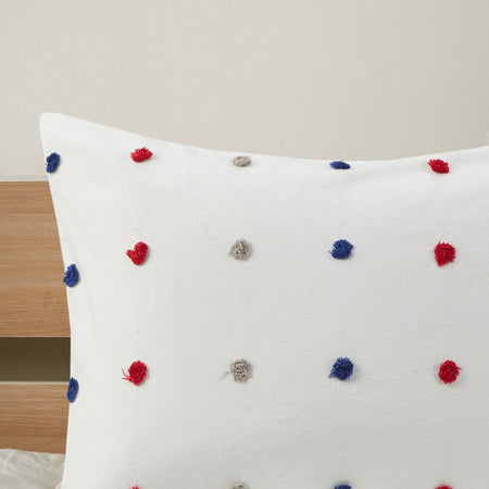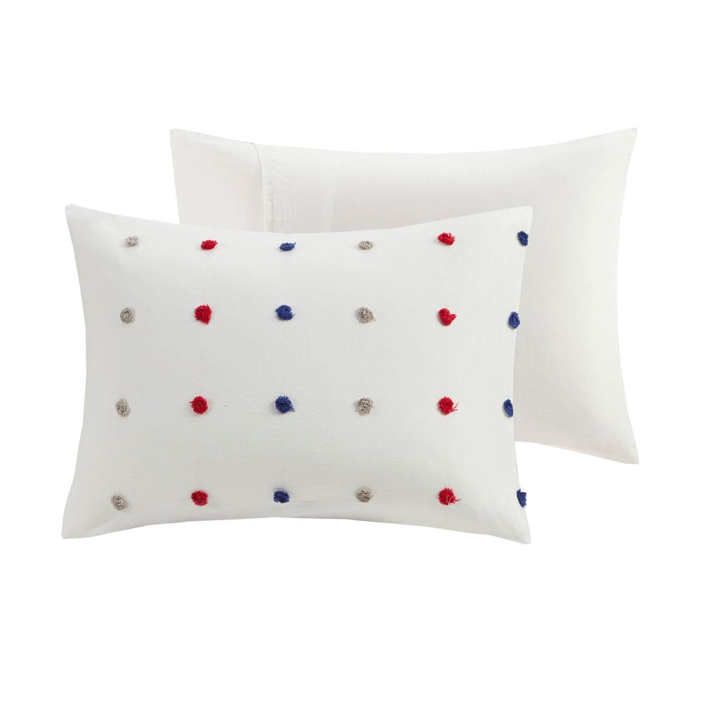 Make a handsome fashion statement in your child's bedroom with the Urban Habitat Kids Callie Cotton Jacquard Pom Pom Comforter Set. This cotton comforter features a red and navy jacquard pom pom design, on the face, for a fun shabby chic look. Matching shams (1 for Twin/TwinXL) pair perfectly with the comforter, while a square and an oblong decorative pillow complete this adorable kid's comforter set. Machine washable, this bedding set is also OEKO-TEX certified, meaning it does not contain any harmful substances or chemicals to ensure quality comfort and wellness.
