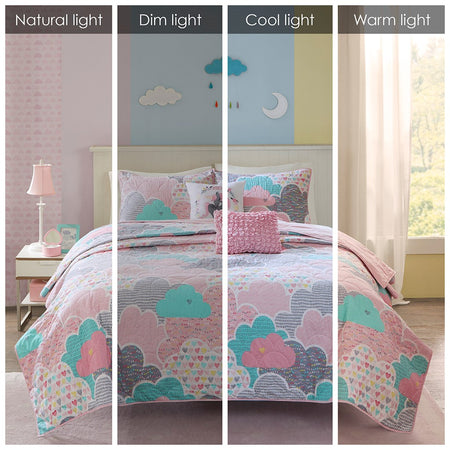 Drift off to dreamland with the whimsical charm of the Urban Habitat Kids Cloud Cotton Reversible Coverlet Set. The coverlet and shams (1 in Twin Sizes) showcase a cute and fluffy cloud motif in a soft colorful palette with a solid reverse. An oblong decorative pillow features all-over ruching and the square pillow features an embroidered unicorn. Made from 100% pre-shrunk cotton, this coverlet set is hypoallergenic and bed-ready right out of the package. This bedding set is also OEKO-TEX certified, meaning it does not contain any harmful substances or chemicals, and uses an antimicrobial treatment that provides built-in freshness protection, reducing the growth of odor causing bacteria to keep fabric lasting longer.