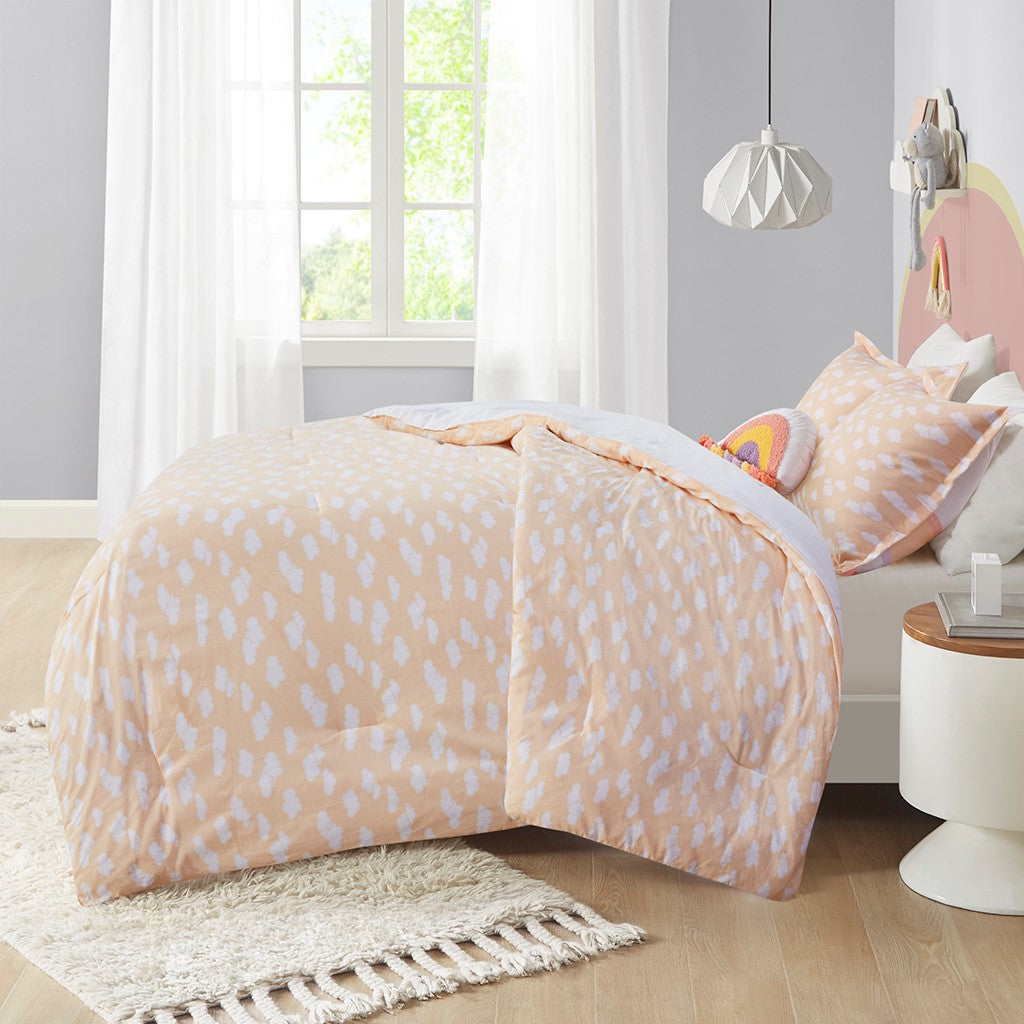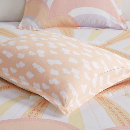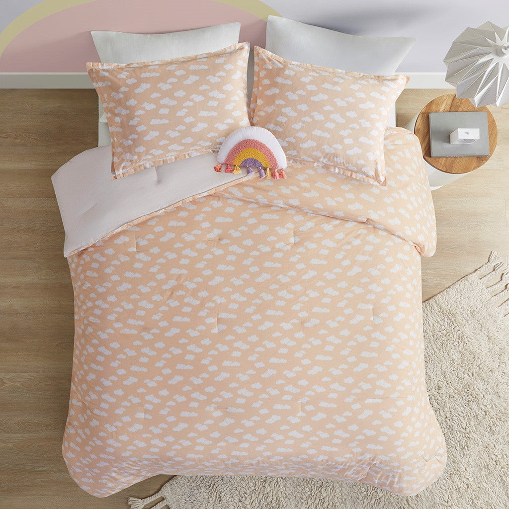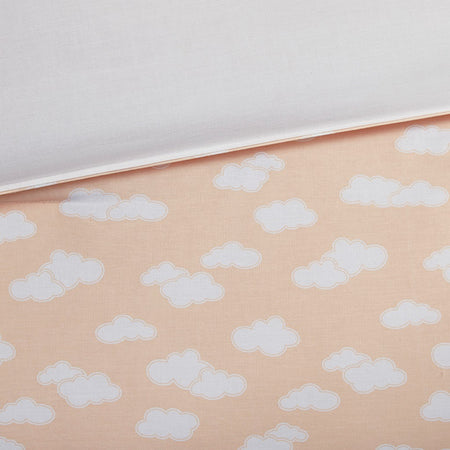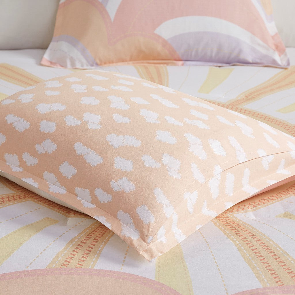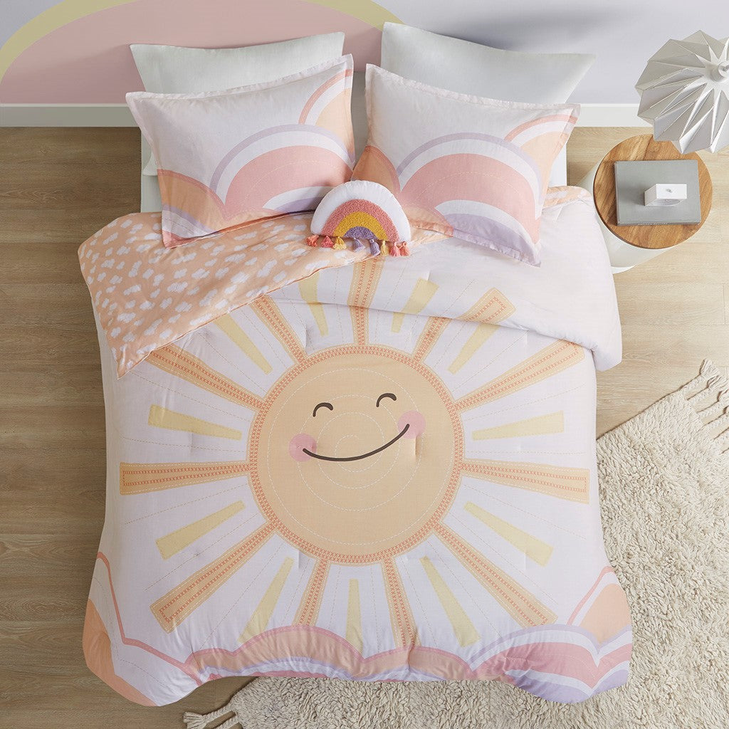 Brighten up your child's bedroom with the Urban Habitat Kids Dawn Sunshine Printed Reversible Comforter Set. This soft yellow and coral cotton comforter features a large smiling sun print with a small scale cloud print on the reverse, for an adorable look. The 2 coordinating shams complement the cheerful design of the comforter, while the rainbow-shaped decorative pillow adds a cute finishing touch.