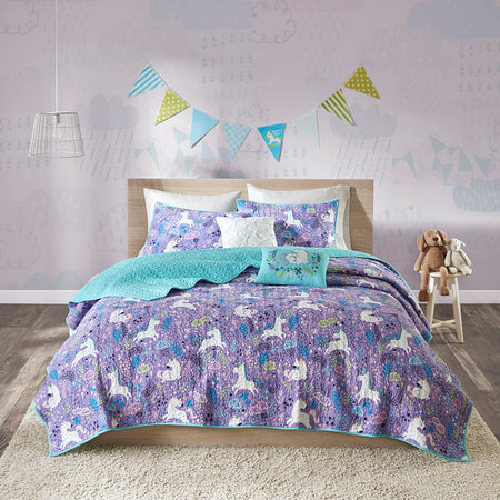 - Fun and whimsical unicorn print cotton coverlet quilt set in purple with white and blue accent colors
