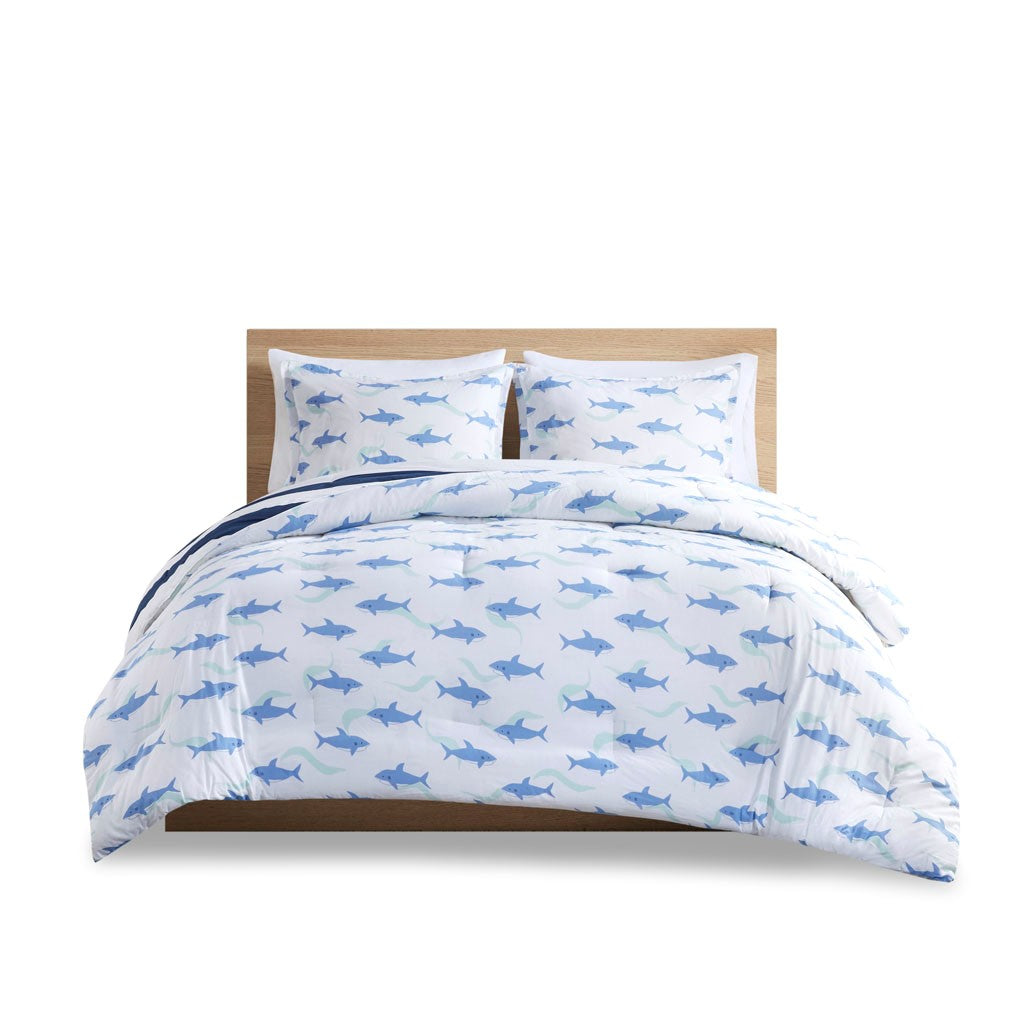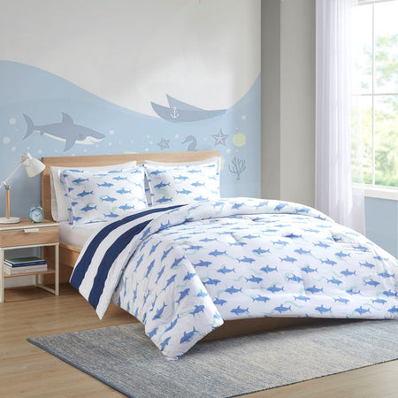 Add a bright and playful update to your kid's bedroom with the Urban Habitat Kids Sammie Cotton Cabana Stripe Reversible Comforter Set. This soft cotton comforter and 2 shams (1 in Twin) features a classic navy and white cabana stripe with a cool shark print on the reverse, for a fun new look. Hypoallergenic polyester filling in the comforter contains no allergens and is treated to be dustproof, and provides exceptional warmth for a restful night's sleep. Machine washable for easy care, this kid's cotton bedding set is also OEKO-TEX certified, meaning it does not contain any harmful substances or chemicals to ensure quality comfort. Bedding may come in rolled or compressed packing and will need to be fluffed up. Use a steam iron to help remove wrinkles easier.