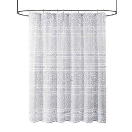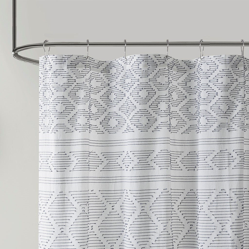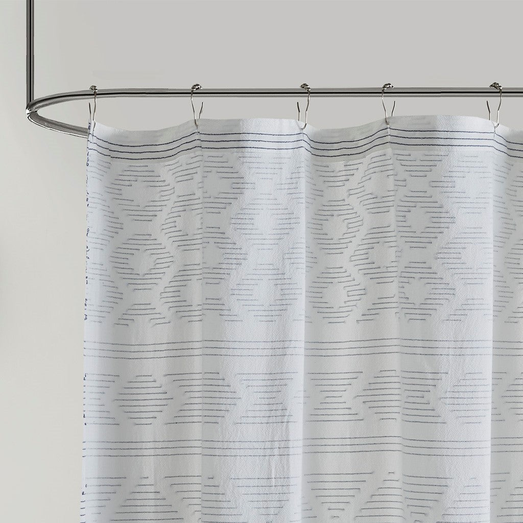 Update your bathroom with our Urban Habitat Lizbeth Cotton Clip Jacquard Shower Curtain. This shower curtain features clipped jacquard geometric patterns, in soft white and indigo colors on a crisp 100% cotton fabric, for a natural and casual modern look. Machine washable for easy care, this shower curtain is also OEKO-TEX certified meaning it does not contain any harmful substances or chemicals to ensure quality comfort and wellness. Each shower curtain measure 72"Âx72"Â and is finished with 12 button holes at the top making it easy to hang; hooks, rod, and a water repellant liner are not included and will need to be purchased separately. Complete the look with coordinating bedding, available and sold separately.