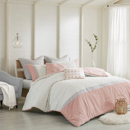 Stylish and comfortable, the Urban Habitat Myla 7 Piece Cotton Jacquard Duvet Cover Set is the perfect update for your bedroom. The 100% cotton duvet cover and shams showcase a pieced design in ivory, grey, and blush hues accented by jacquard tufted dots with a solid blush reverse. Two quilted Euro shams add extra dimension to the bed, while two decorative pillows add the finishing touches. This bedding set is also OEKO-TEX certified, meaning it does not contain any harmful substances or chemicals to ensure quality comfort and wellness. Button closures on the duvet cover secure a padded insert (NOT included) within the duvet cover and internal corner ties prevent it from shifting.