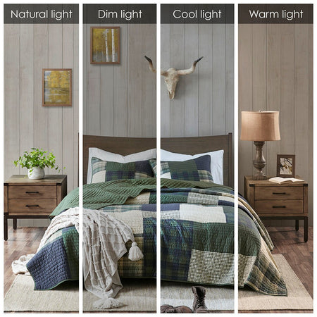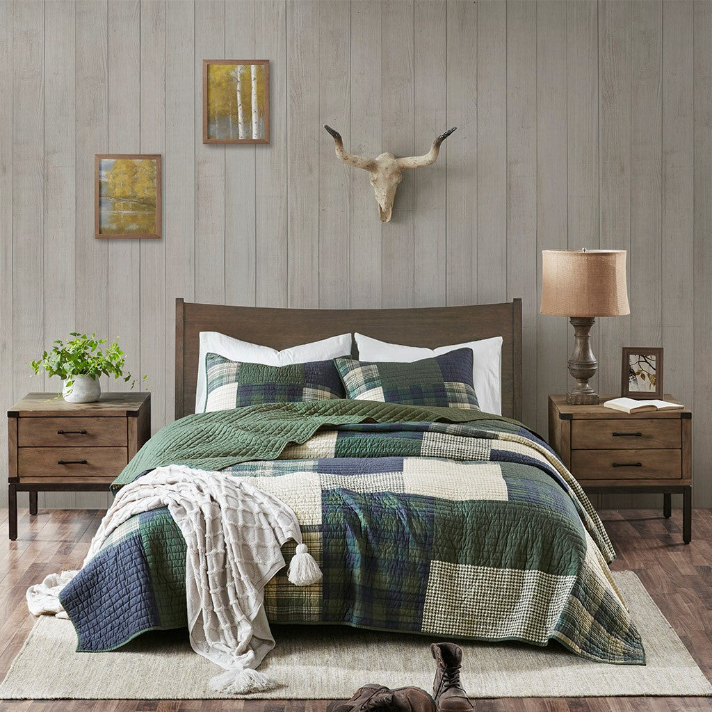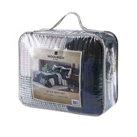 Create a cozy cabin look in your bedroom with the Woolrich Mill Creek quilt mini set. The cotton quilt and matching shams feature a pieced patchwork design, in green, navy, and taupe hues, that elevates your bedroom with an inviting lodge allure. Pre-washed cotton-rich filling provides comfort and durability, making this oversized cotton coverlet perfect for use in the summer or as a layer for extra warmth in the winter. This patchwork quilt mini set is also machine washable to make cleaning a breeze.