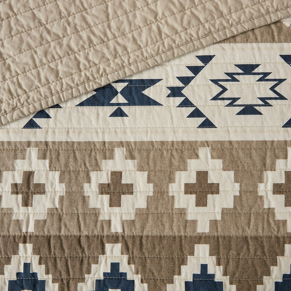The Woolrich Montana Oversized Printed Cotton Quilt Mini Set brings a cozy country update to your bedroom. This cotton coverlet features printed geometric patterns, in tan, blue, and cream hues, for a rustic cabin charm. Pre-washed cotton filling provides extra durability and comfort. Two matching shams coordinate with the top of the bed to complete the cotton quilt set. Use this coverlet by itself for the summer season or as an extra layer of warmth in the winter.